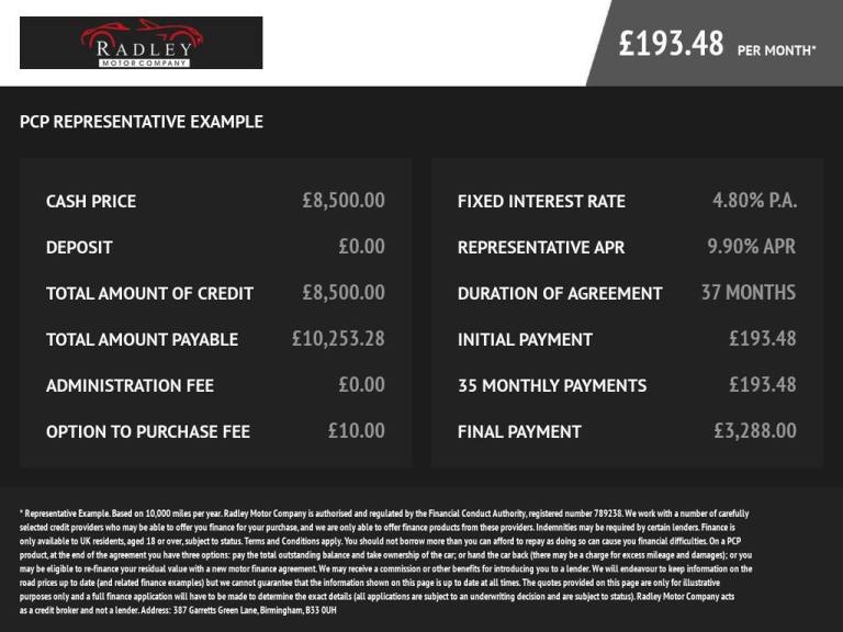 Only 5 minutes from junction 6,M42 NEC Birmingham RADLEY MOTOR COMPANY are a family run business now in its 30 the year in Birmingham .We pride ourselves on the highest standard of service to all our customers. All our vehicles are of the highest standard, normally low mileage and with service history, we inspect and valet every car prior to it going on sale and prior to delivery all cars .We offer a very personal service and although we are efficient, we are City people doing most of our business to other City people whom almost always by car after car from ourselves.Although we are genuine honest City people we still have all the facilities to do finance at exceedingly good rates, as we are here to sell the cars not to earn massive finance commissions, we can also cater for people with less than impeccable credit history.To help you purchase your vehicle, comprehensive finance packages are available. For more information give us a ring If you are looking for a quality car with superb after sales service, then RADLEY is the place for you.At RADLEY we also offer a full range of services to all makes of cars to the highest standard . Our Showroom are open and immaculate so you can see the vehicles should you wish.Within the site you will find information on all our fine selection of used vehicles on our virtual showroom, which is updated constantly, listing the latest cars with images and details, currently in stock on our forecourt.You can also find details on how you can contact us regarding any questions you may have or for further details on any of the vehicles you've seen in our virtual showroom.We look forward to receiving your enquiries. OUT OF HOURS MOBILE FOR SENSIBLE ENQUIRIES [Phone number removed] WE ARE OPEN ALL OVER THE HOLIDAYS