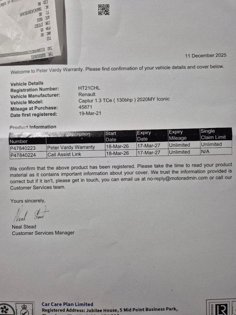 Then the Peter Vardy Car care plan nationwide warranty till 18th March 2027
