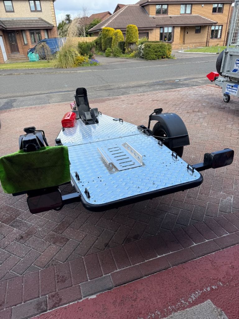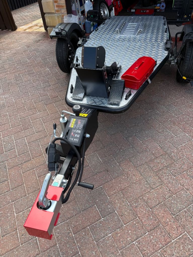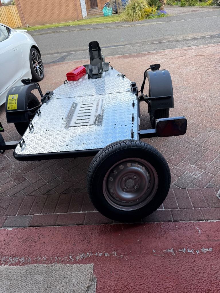 Dedicated single axle trailer for transporting motorcycles ( to/from the track, punctures, european tours etc ) with a total carrying capacity of 750kg ( incl trailer ) Load capacity 585kg, Kerb weight 165kg. The trailer is hot dipped galvanised with an aluminium floor. Included in sale is spare wheel,spare wheel carrier, SAS hitch lock. Excellent condition as seen from the photos.