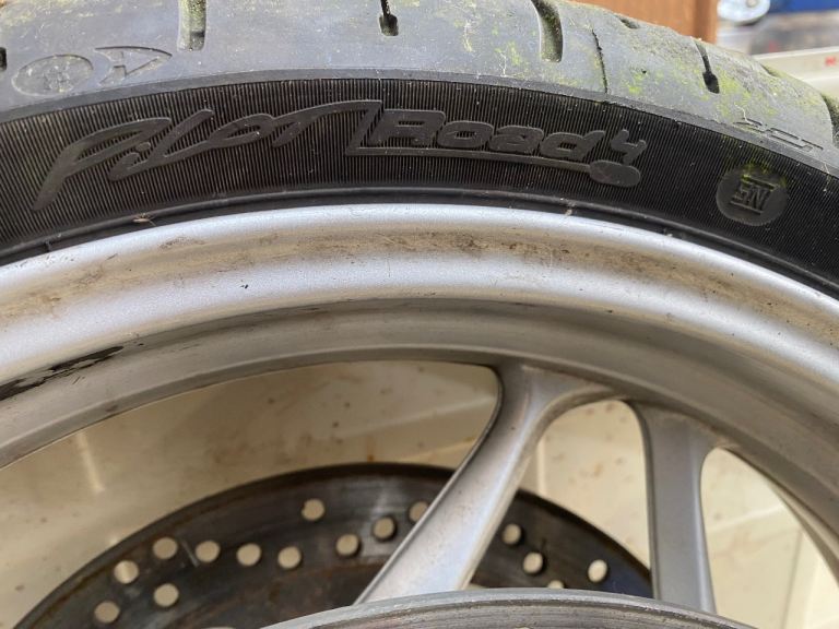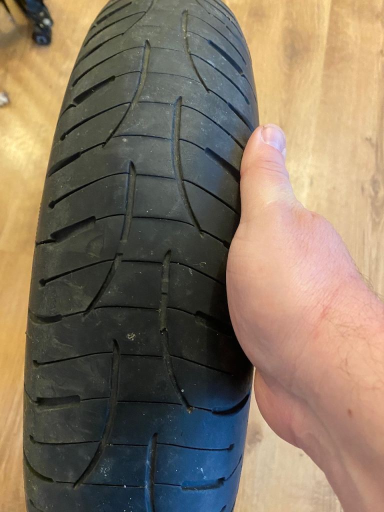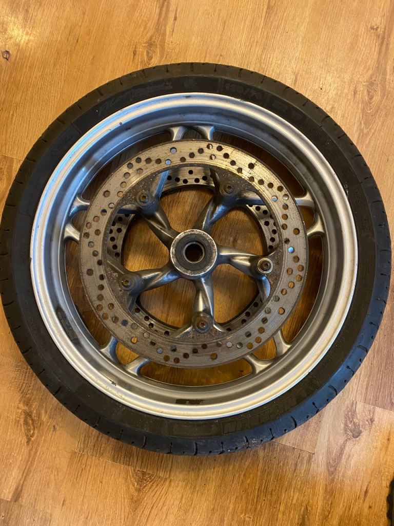 BMW f800 front wheel with Michelin pilot road 4 tyre also includes spindle and spacer