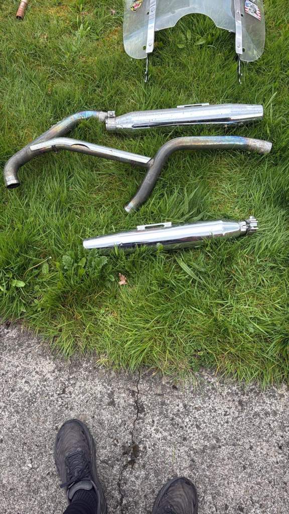 Posting for 5+ yearsHarley Davidson motorcycle parts - visor, exhaust pipes, wheel, flag, jack, bag
