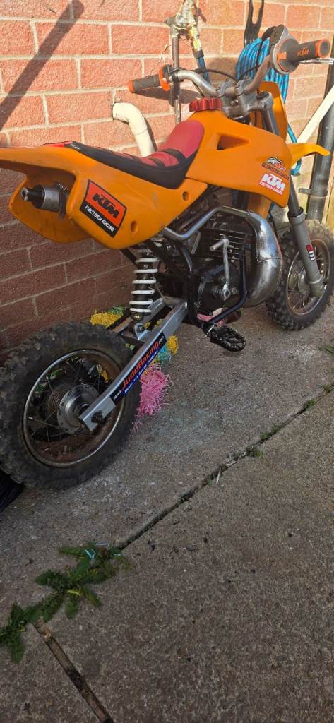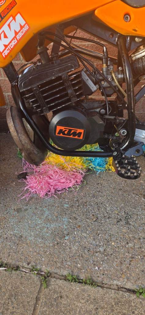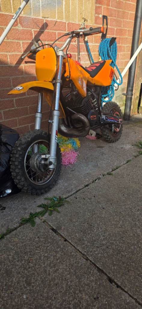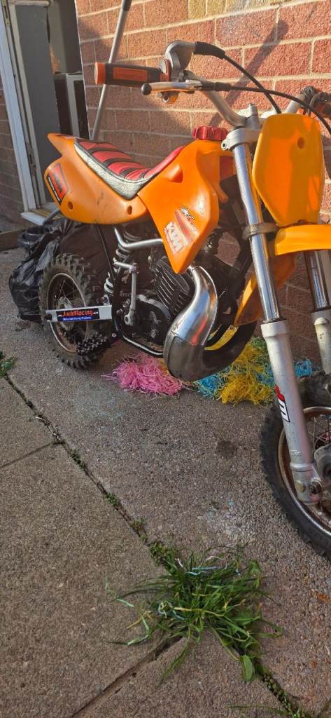 Ktm sx 50cc pro senior starts and runs both brakes work could benefit from a carb clean where it's been sitting in the garage for over a year but still rides and runs just a touch boggy other that that the bike is fine £450