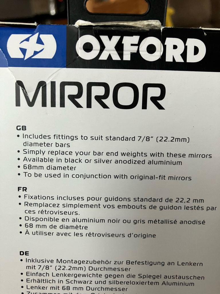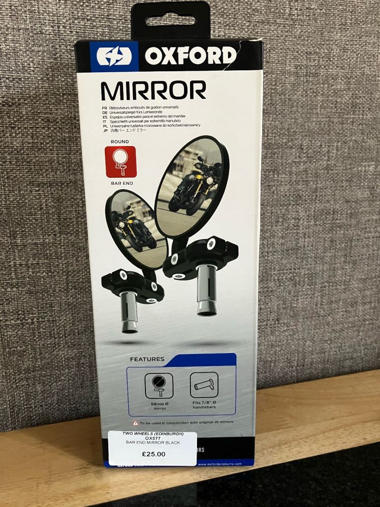 Oxford Bar End Mirrors, 68mm diameter mirror, 12-18mm diameter expansion bushes, hardly used still in excellent condition, should fit most motorcycle handlebars, universal fittings,£25 new.