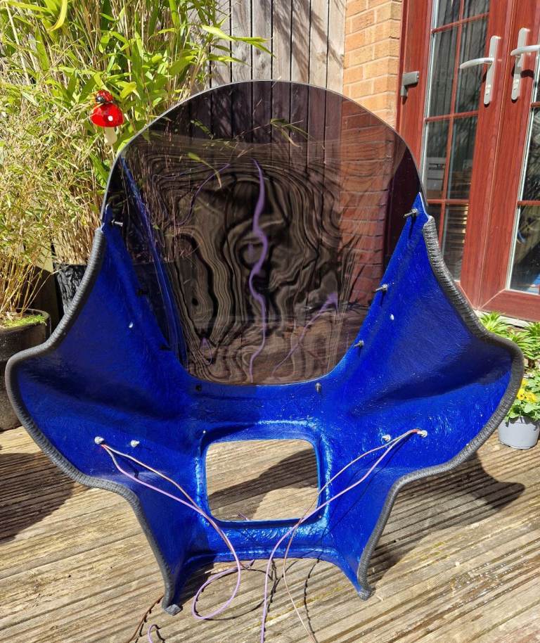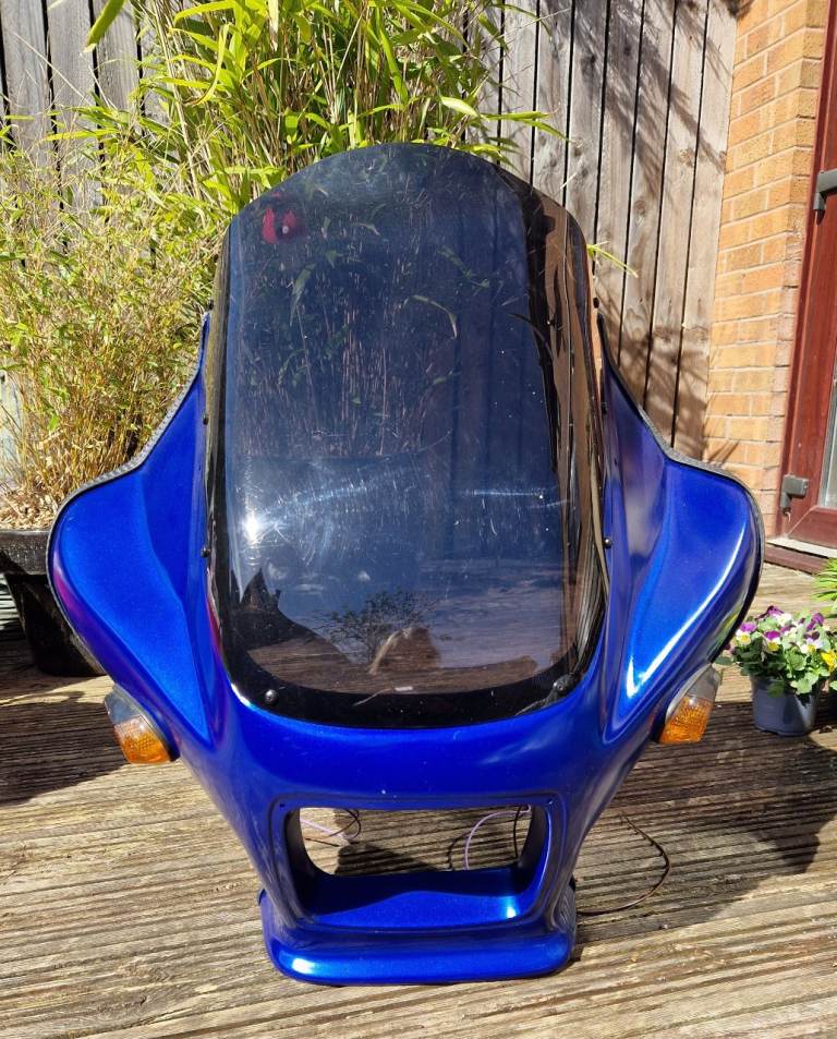 Motorcycle fairing mostly for Kawasaki's GT 550 / 750. Been resprayed in Kawasaki blue. Some mounting brackets.
