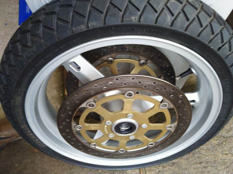Suzuki GSXR 17" front wheel. Complete with discs. Very good condition. Silver. 2000-2001 model. 750/1000cc. May fit other models.