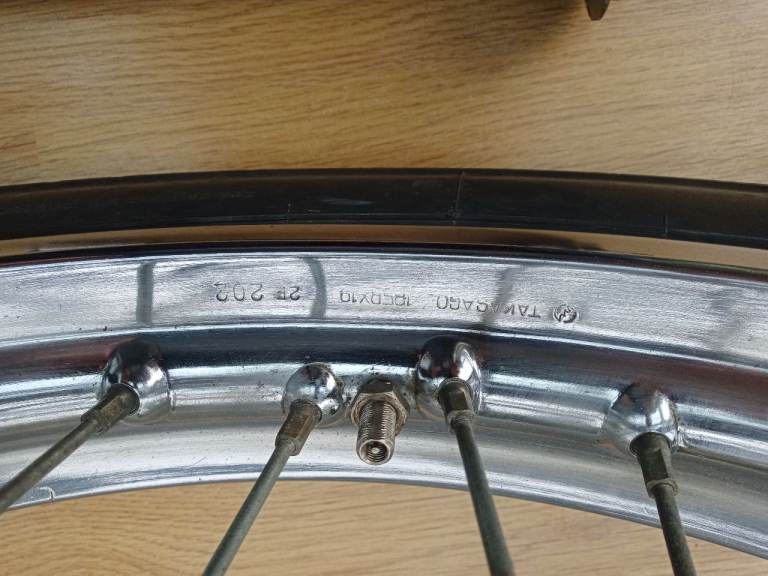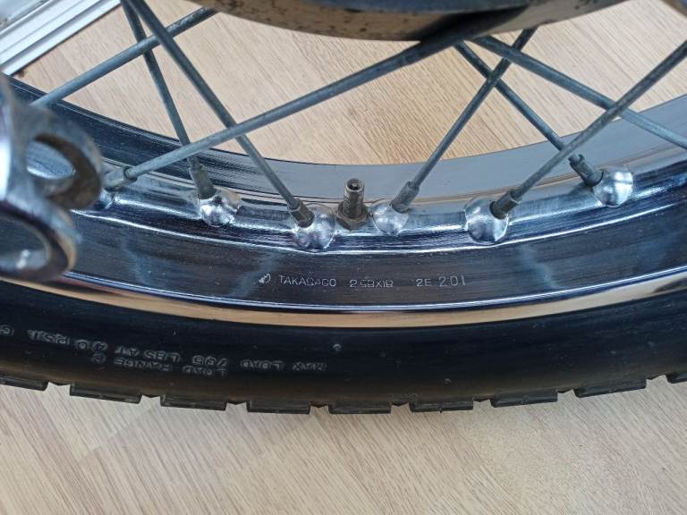 Both wheels are original TAKASAGO wheels, removed from a low mileage 1972 Yamaha XS2 which has been dismantled, and parts being sold separately, including frame & running engine with carbs etc, and many more parts.