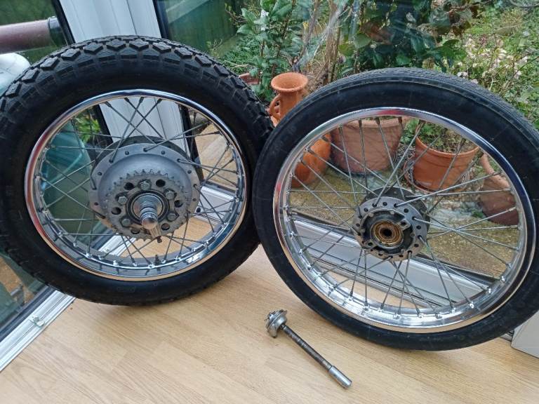 Posting for 13+ yearsYamaha XS2 (1972) Complete Front & Rear Wheels, Axles, Brake Plate, Speedo Drive in VGC