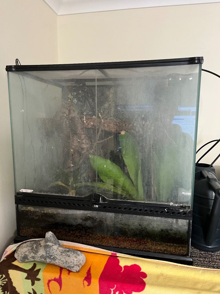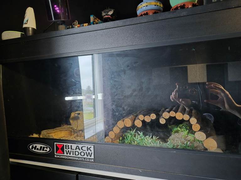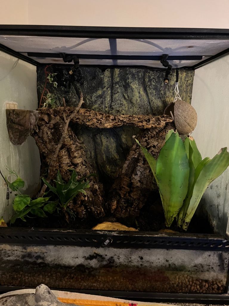 He comes with fully bioactive terrarium, climbing logs, two live plants and drainage balls.