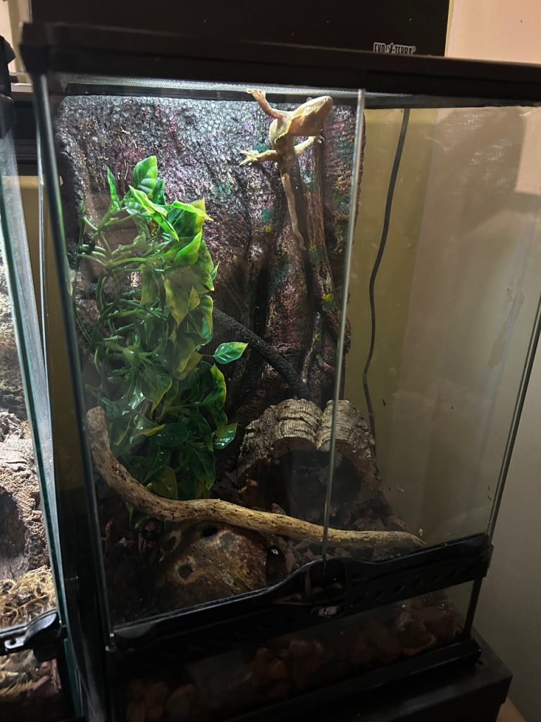 About 3yrs old. Male, crested gecko. Comes with tank and light. Feeds off wet food. Date of birth approx.