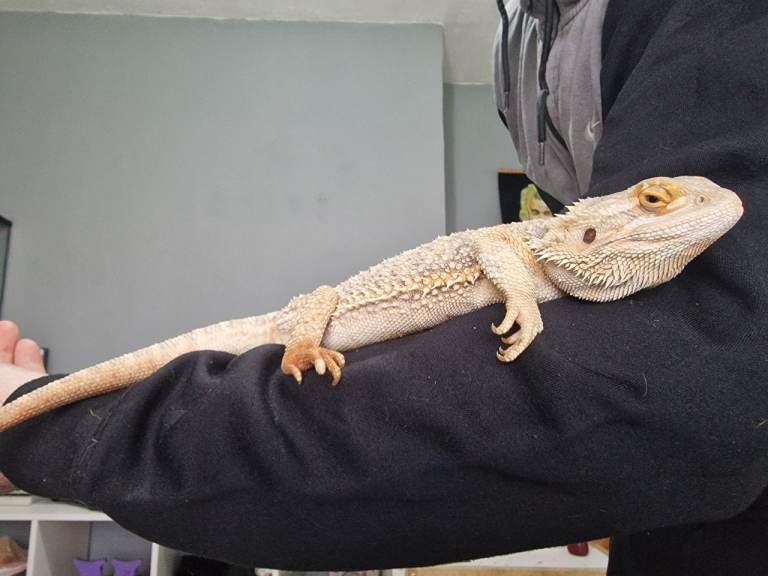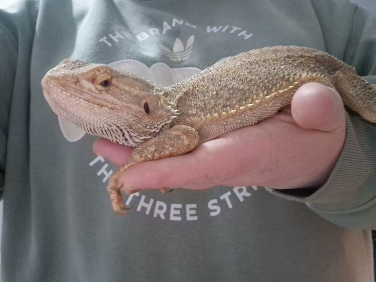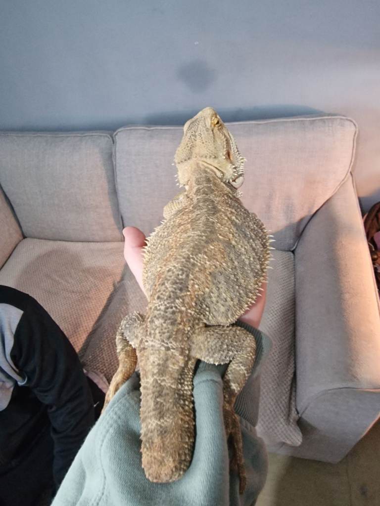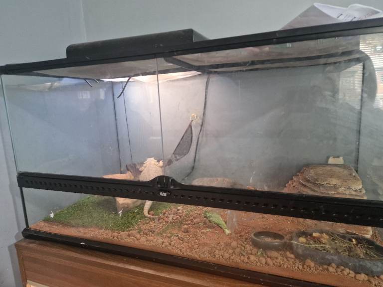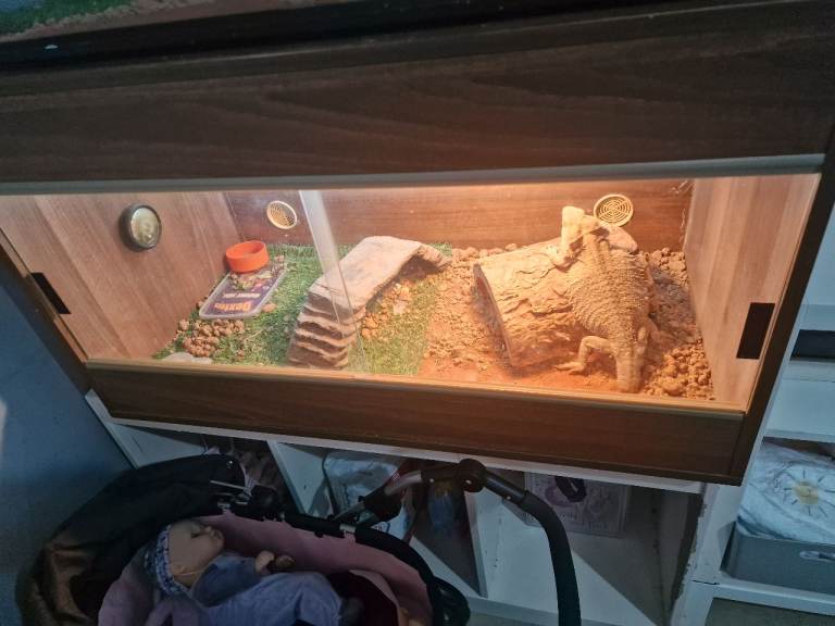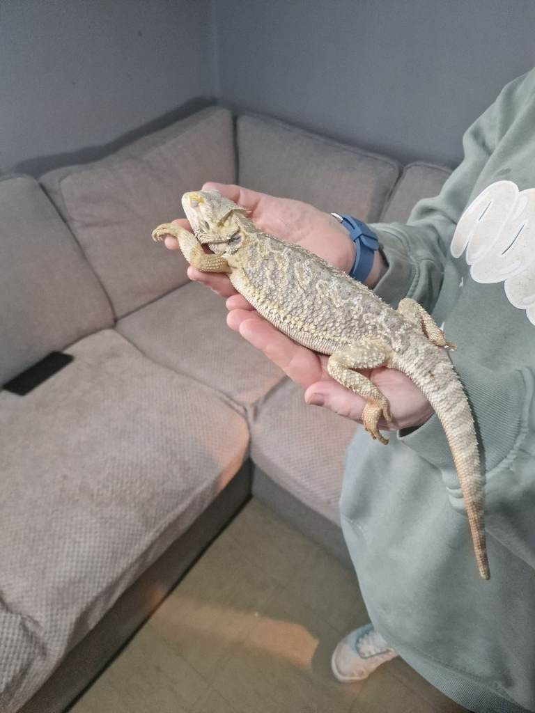 I have a nearly 2 year old female bearded dragon with enclose. Her name is tiger. Loves being handled, loves baths and she can be hand feed too. Tiger has been with us since she has been a baby. She is good around kids and dogs. Have the enclose, hammock, lights, and logs. Also if have an adult male bearded dargon with enclose. His name is maui and he has a wee stump for a tail. He loves been handled but sometimes he will jump out of your hands. We got maui a year ago. He can be hand feed too. He good with kids and dogs also. I've worms here well to go. Enclose, lights and logs with him too. Female is the 2nd,3rd and 4th pictures and the male is the 6th, 7th and 8th pictures. Both can go now and dont know the dates when born