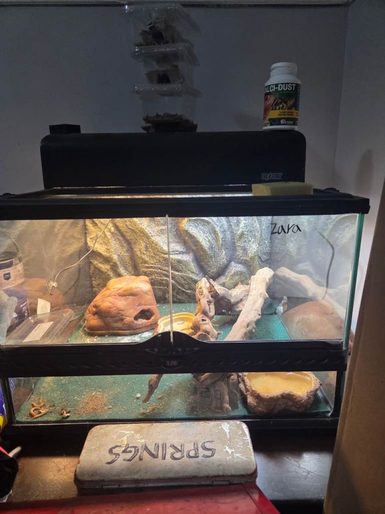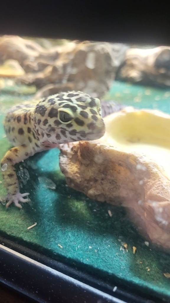 The leopard geko is called zara she is 1 years old. The tank is an exo terra 45×45 and has a UV light added on and full internal setup. it also has heat pad and a thermometer. She also has food and Reptile calcium. She is well handled and eats from the hand aswell. But she is looking for a good home.
