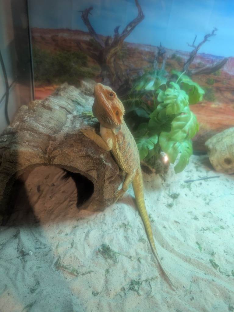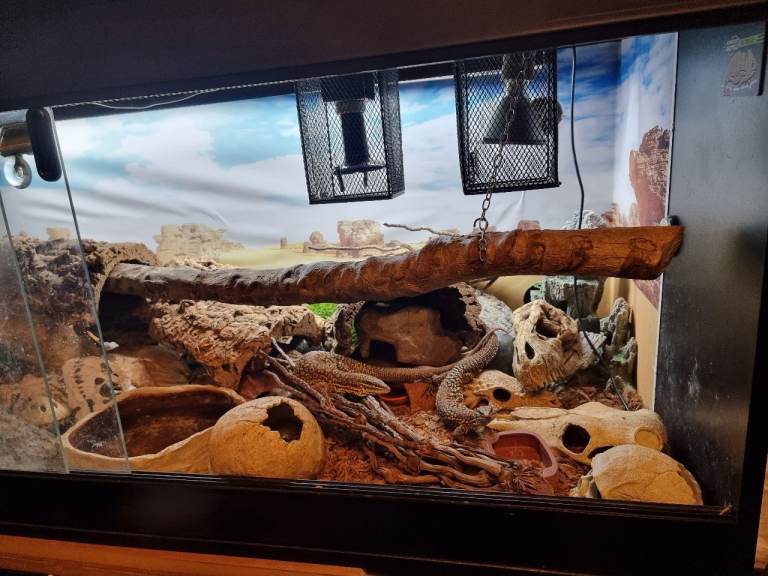 Plenty of rocks, sharp and rounded, cork barks, hides, a hanging log for climbing, soil digging and nesting box, egg box.