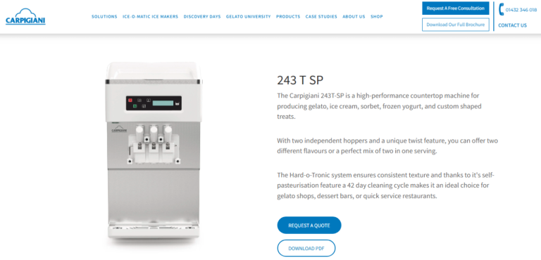 The Carpigiani 243T-SP is a high-performance countertop machine for producing gelato, ice cream, sorbet, frozen yogurt, and custom shaped treats.
