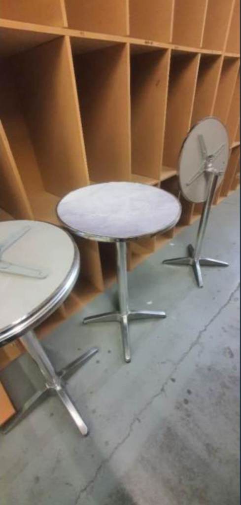 Silver marble-style tables – sleek, lighter, elegant café style — £40 each