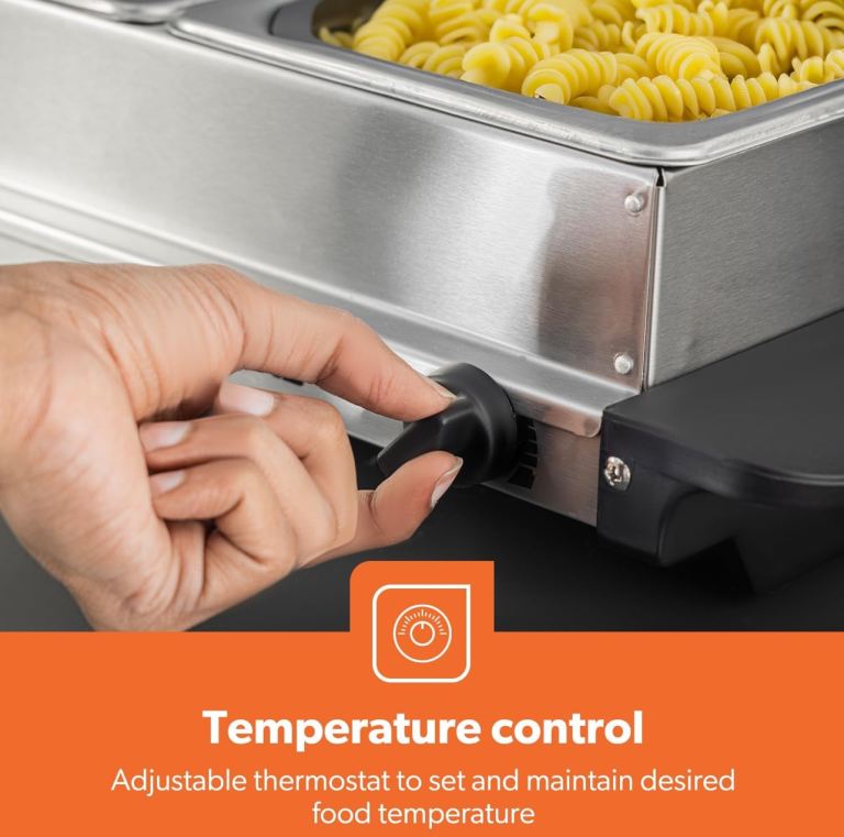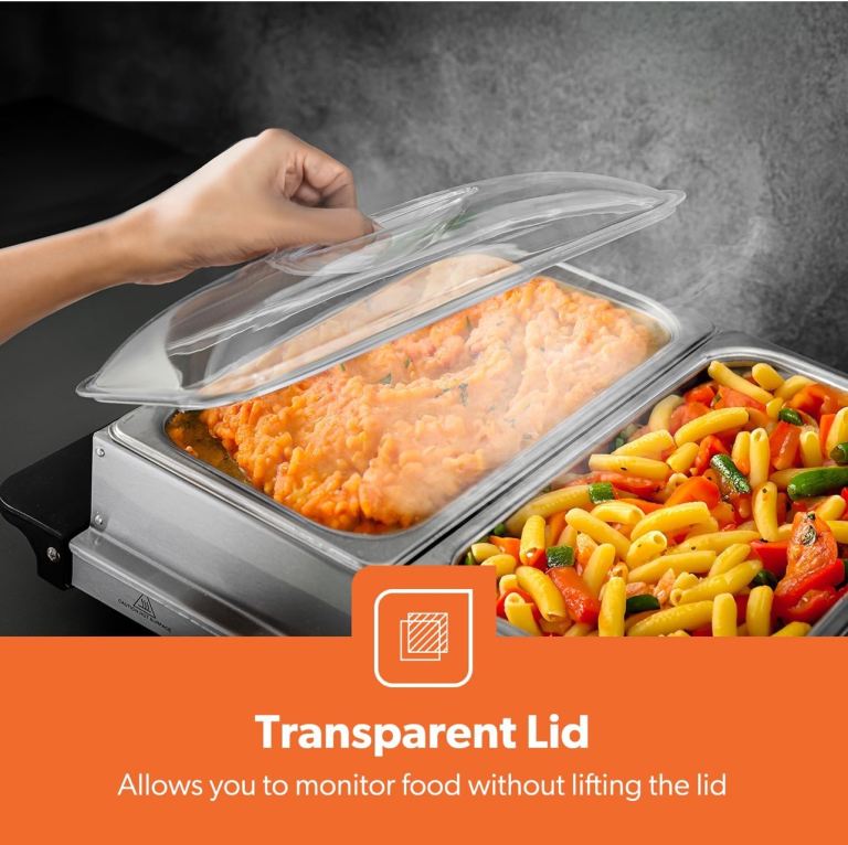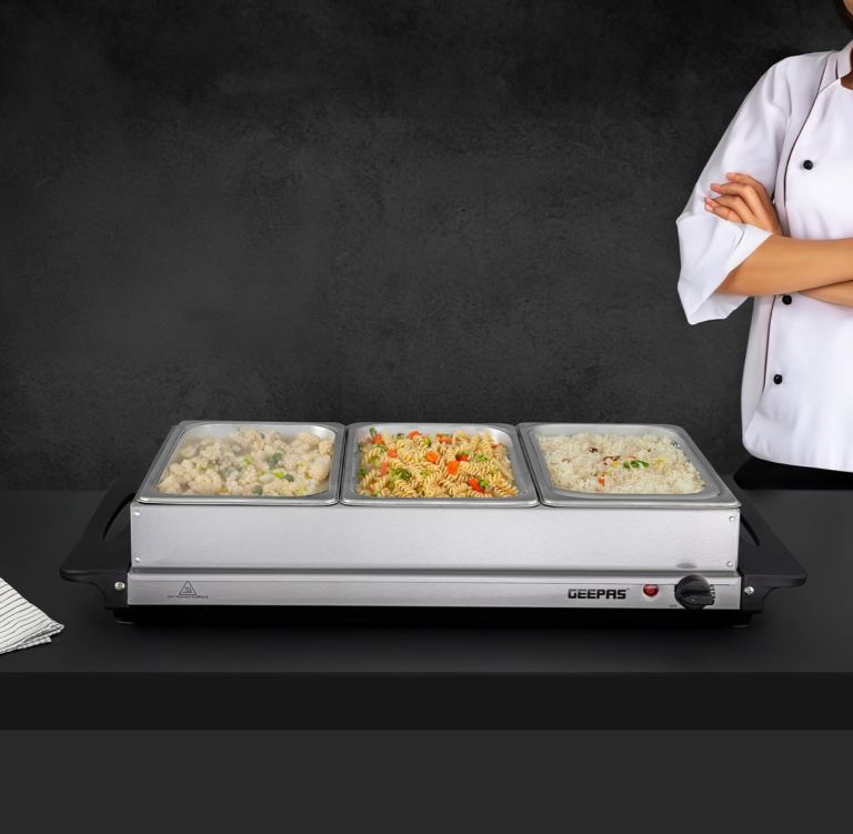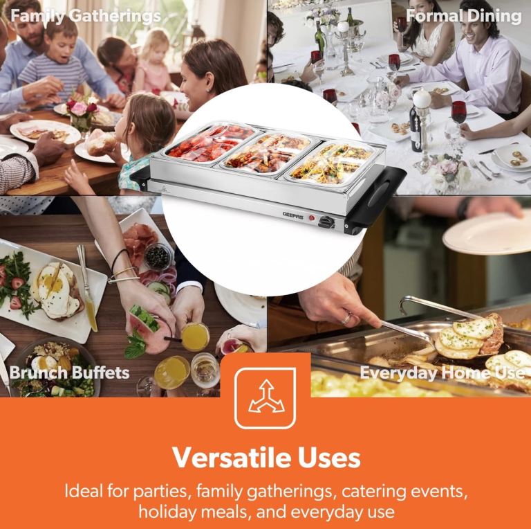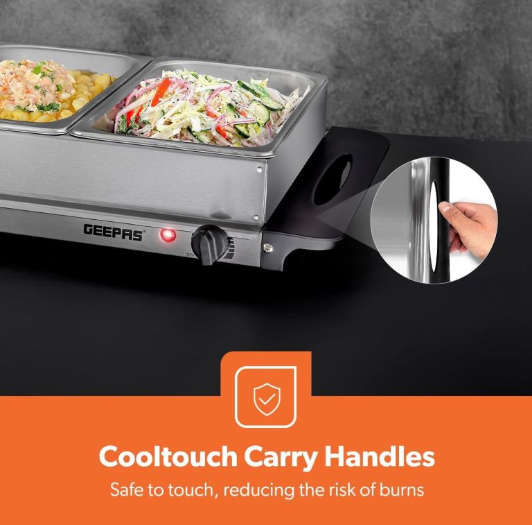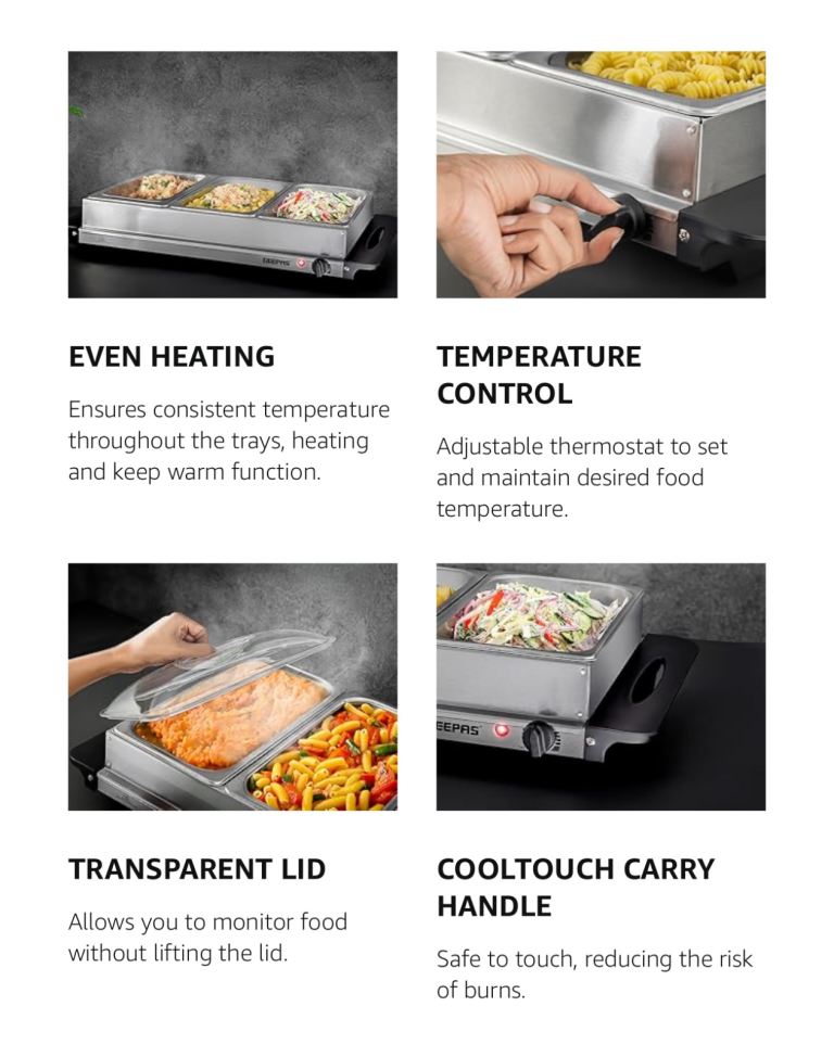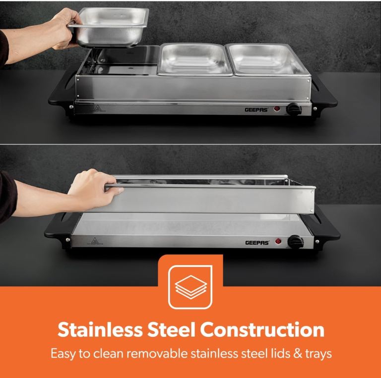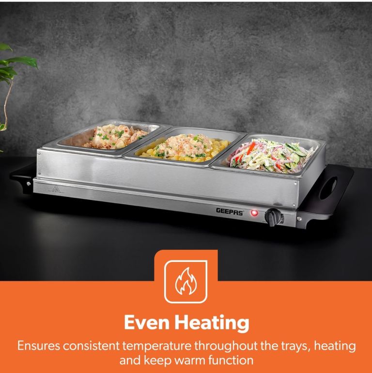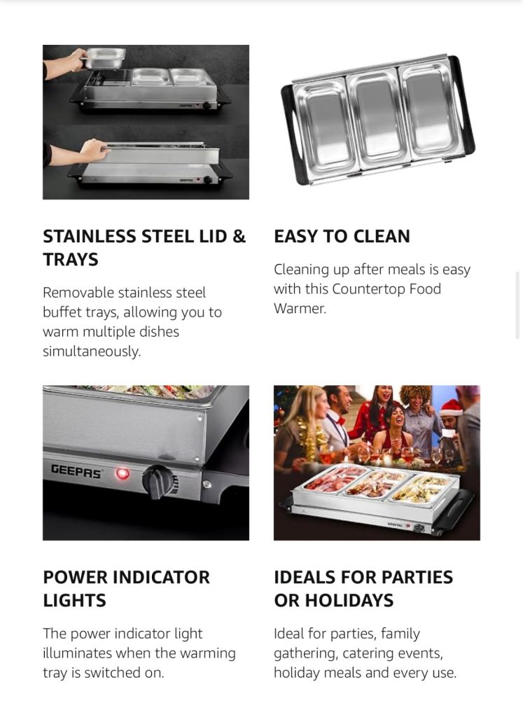 ✅ REMOVABLE STAINLESS STEEL BUFFET TRAYS WITH LIDS - The Geepas 200W Electric Food Warmer comes with 3 spacious 1.5L removable stainless steel buffet trays, allowing you to warm multiple dishes simultaneously. Each Stainless-Steel Food Warmer tray has a transparent lid, letting you monitor your food without lifting the lid and losing heat. Ideal for buffets and large meals, these trays provide ample space for occasion. ✅ COOL TOUCH HANDLES - Safety is a priority with the Geepas Buffet Food Warmer. The cool touch handles ensure safe and easy handling, even when the appliance is hot. Move and transport your food warmer without worrying about burns or accidents. ✅ VARIABLE TEMPERATURE CONTROL & PLATE WARMER FUNCTION - Customize your warming needs with variable temperature control. Adjust the heat settings to suit different types of dishes, ensuring they are kept at the perfect temperature every time you serve. The keep-warm function maintains this ideal temperature, so your food is always ready to enjoy. ✅ EASY TO CLEAN - Cleaning up after meals is easy with this Countertop Food Warmer. The removable stainless-steel trays and smooth surfaces make it easy to wipe down and clean. ✅ HIGH EFFICIENCY AND ENERGY SAVING - The Catering Food Warmer is designed for high efficiency and energy saving. Its 200W power maintains the desired temperature for your dishes while consuming less energy. This makes it an eco-friendly and cost-effective choice.