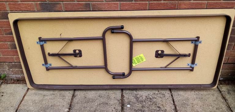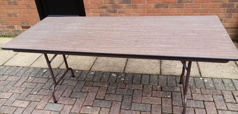 2 heavy duty folding banquet catering tables in walnut finish top. Dimensions 1830 X 760 X 760 mm. Perfect for indoor use featuring metal brown folding legs for easy storage. Has rounded edges to prevent guests from bumping into sharp corners. £95 each or £170 for both tables