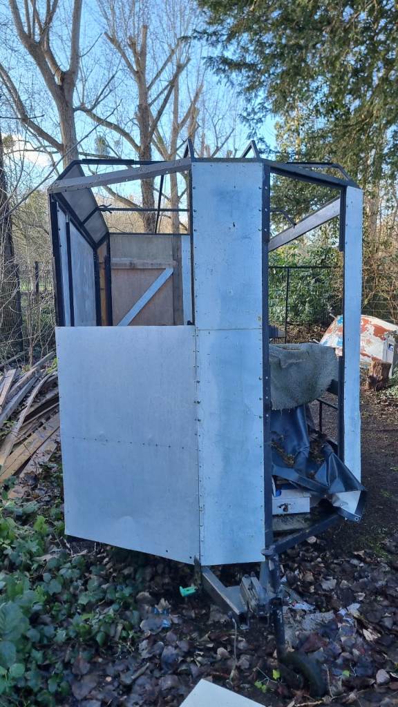 1 is a metal frame with sheet metal cladding, partly installed. Front door and catering flap supplied. Most sheets are cut and painted, ready to be riveted on.