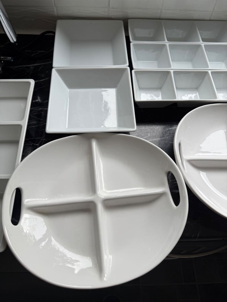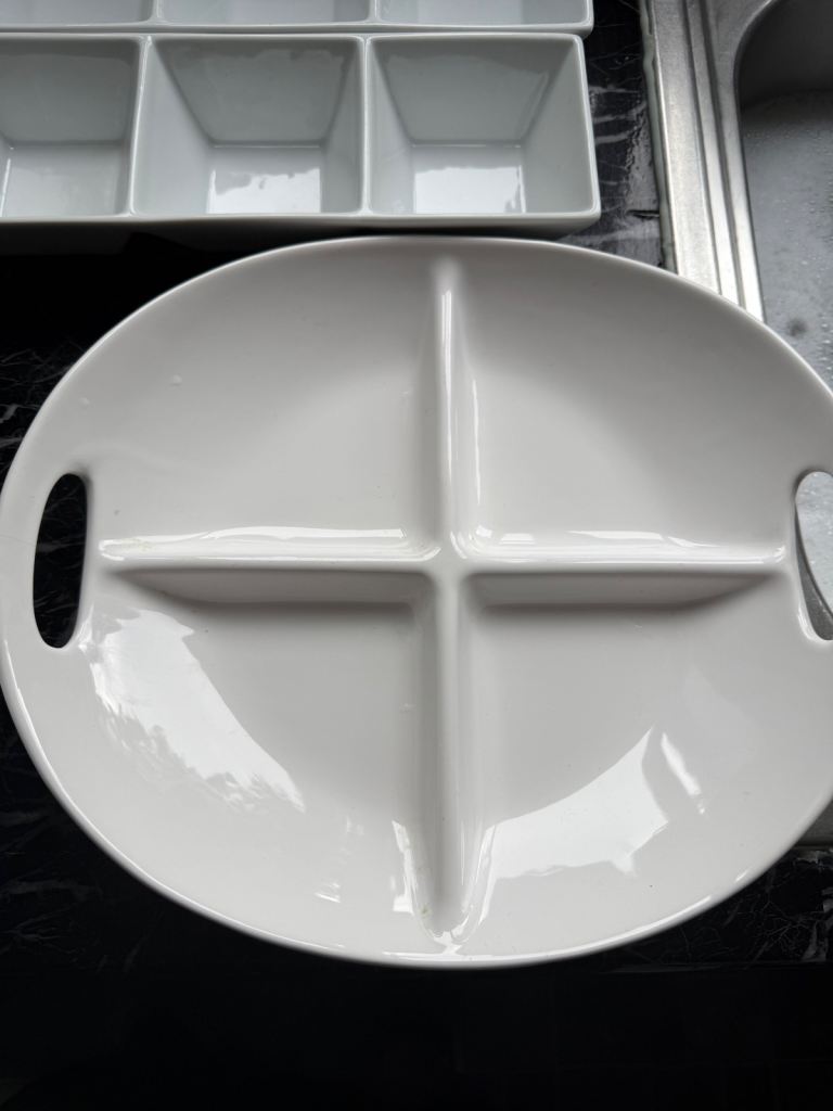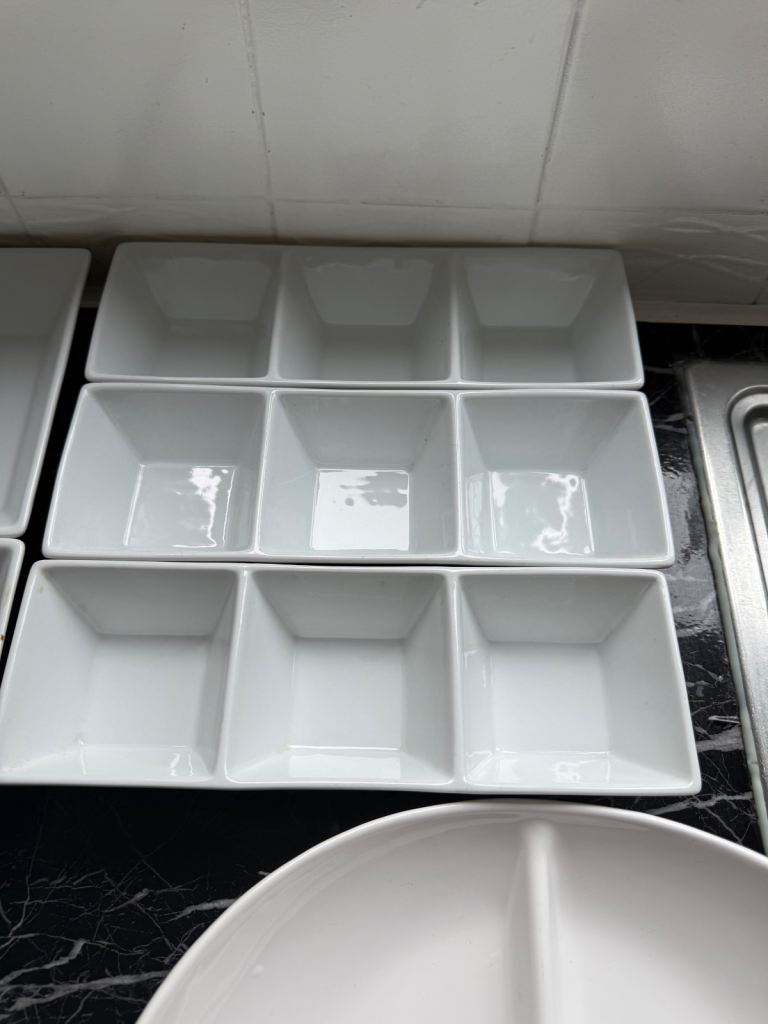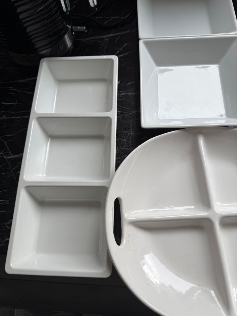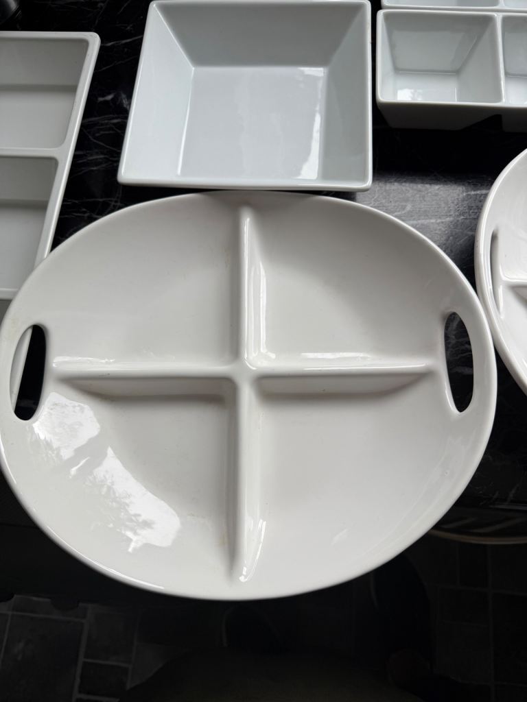 I have a selection of catering dishes/sauce no chips hardly ever used made in Portugal surplus to requirements.they are fairly heavy not plastic except for the larger 3 segment one which is melamine.