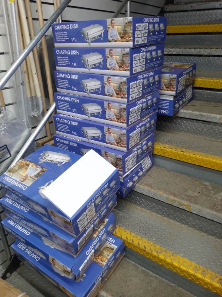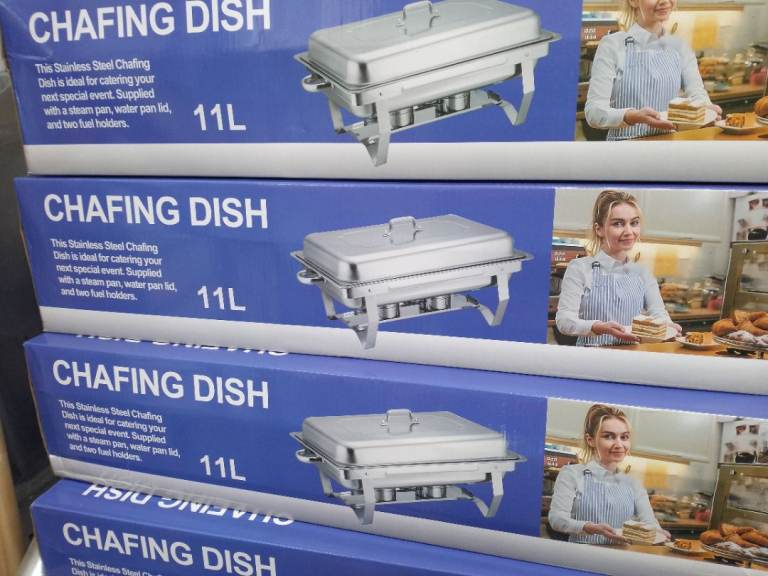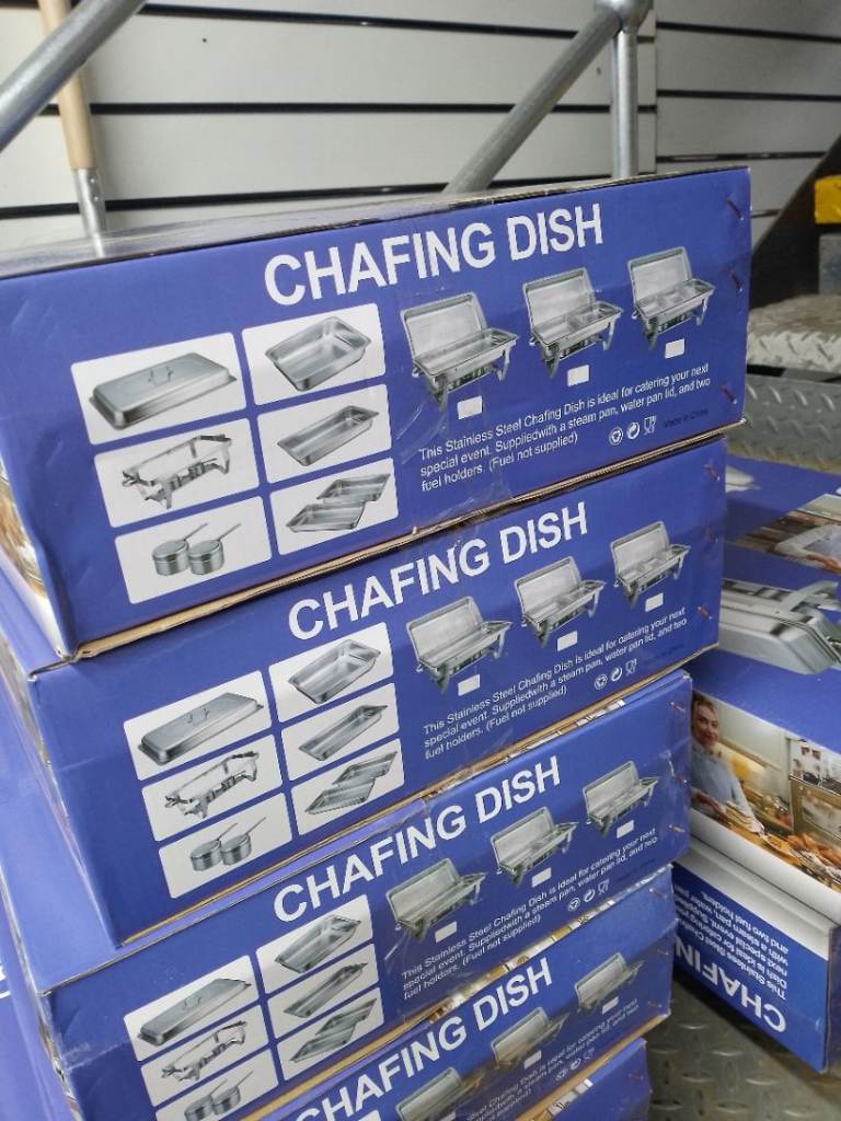 chafing dish is a serving pan used to keep food warm at a buffet or catered event. It works by placing food in the upper pan, which is heated indirectly by a container of hot water in a lower pan. Heat is provided by either a traditional chafing fuel like alcohol or an electric/induction element, and chafing dishes are designed to maintain food temperature