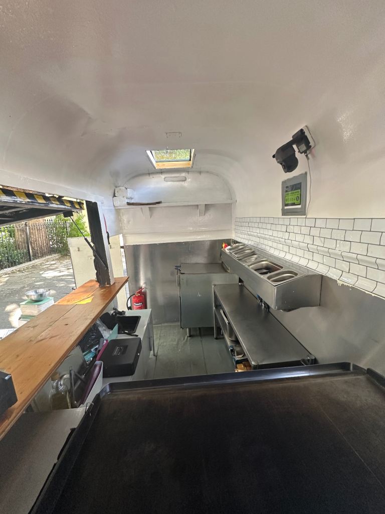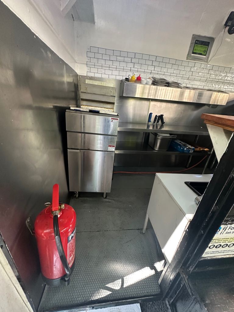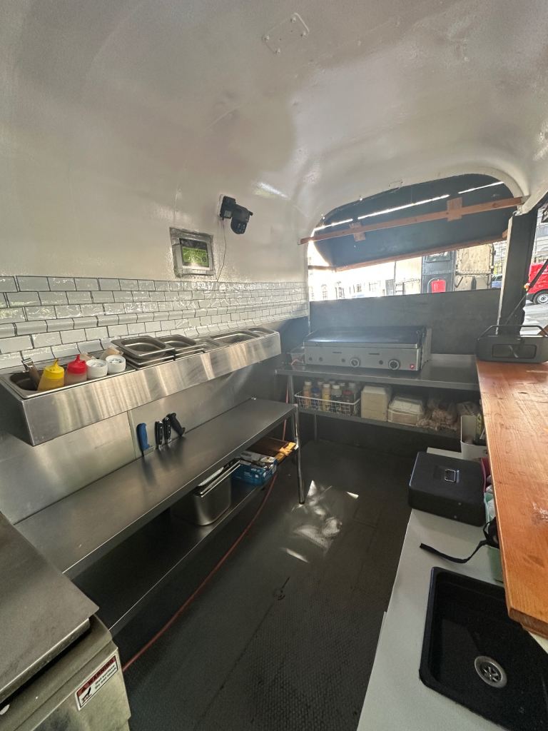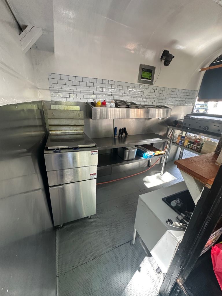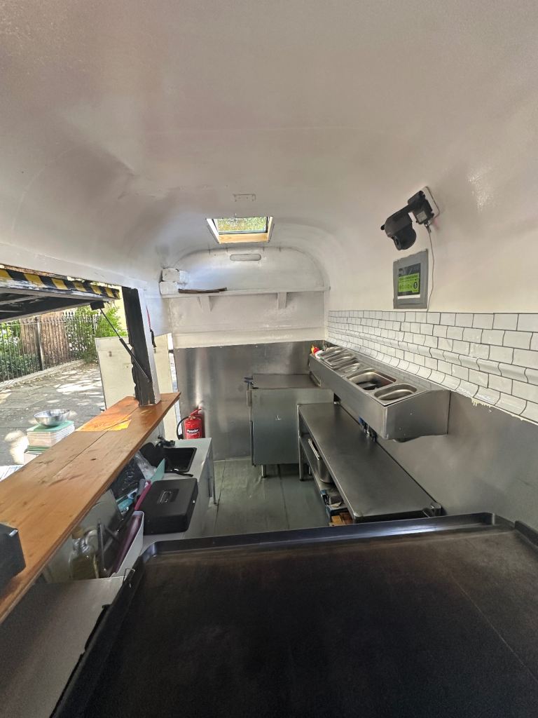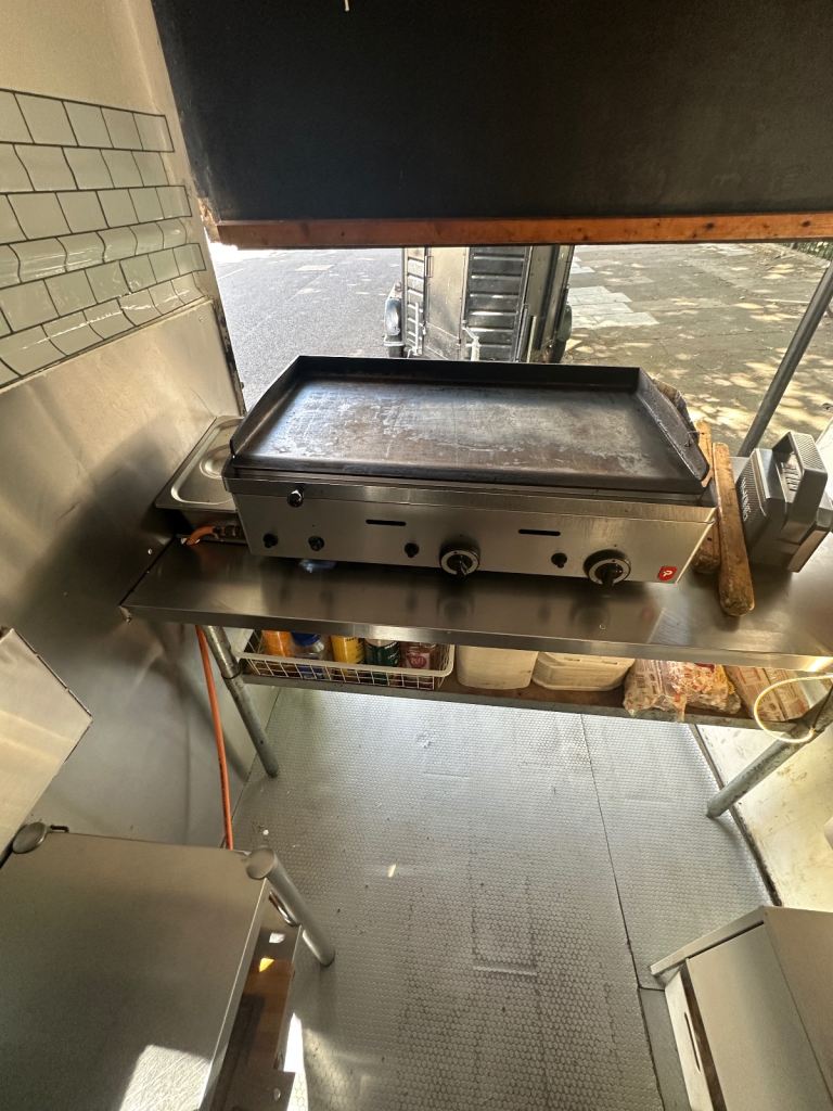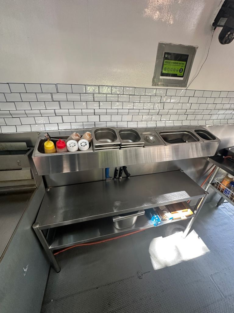 Excellent condition, ready to work, lpg gas installed with gas safety certification. Deep fryer 28litres 70cm griddle, worktops stainless steel and stainless steel covered walls, sink fire extinguisher, fire blanket . Has 5stars rating for food hygiene and safety by local authority. Ideal for burgers, fried chicken, sandwiches and more . I can deliver to your place for free of charge.