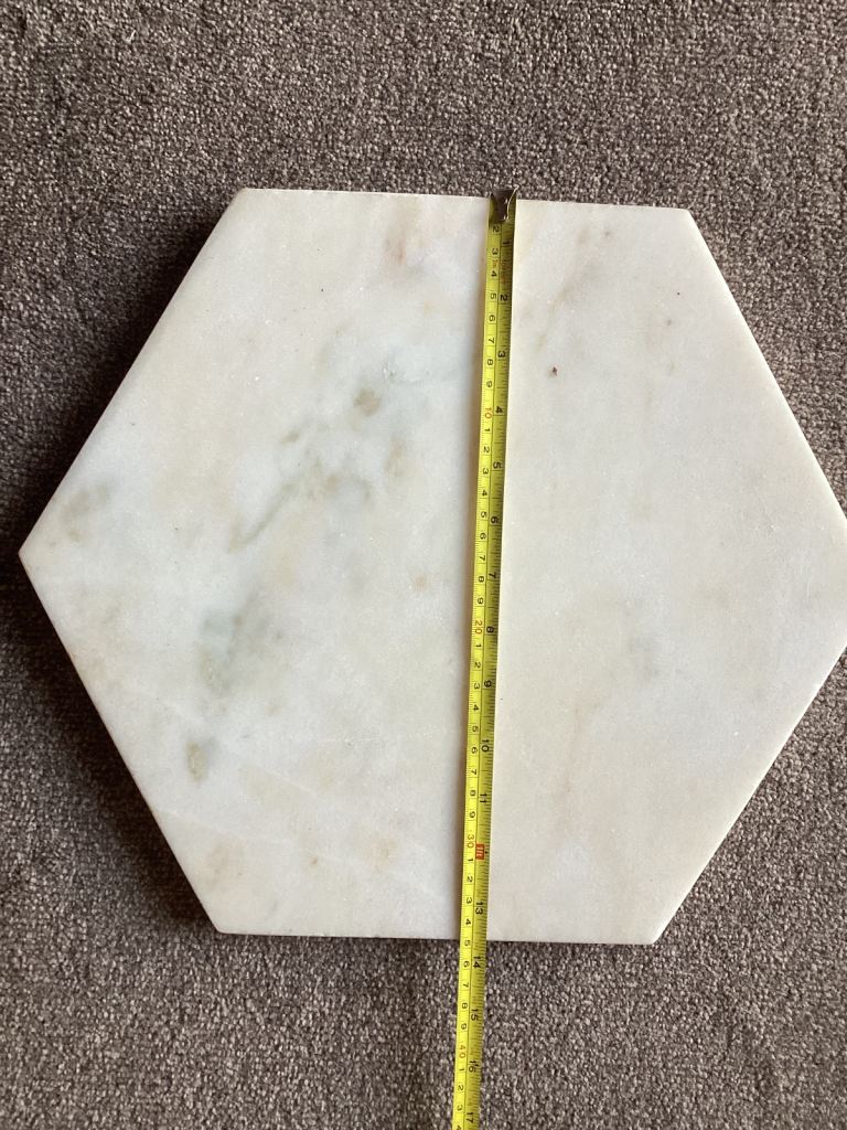 In white marble preparation food plates, ideal for cutting up vegetables, meats, and other items for in the kitchen ,2 cm thick lovely for preparing food or other items on ,40 cm x 35 cm one only available with pads on rear so on movement ( very heavy)