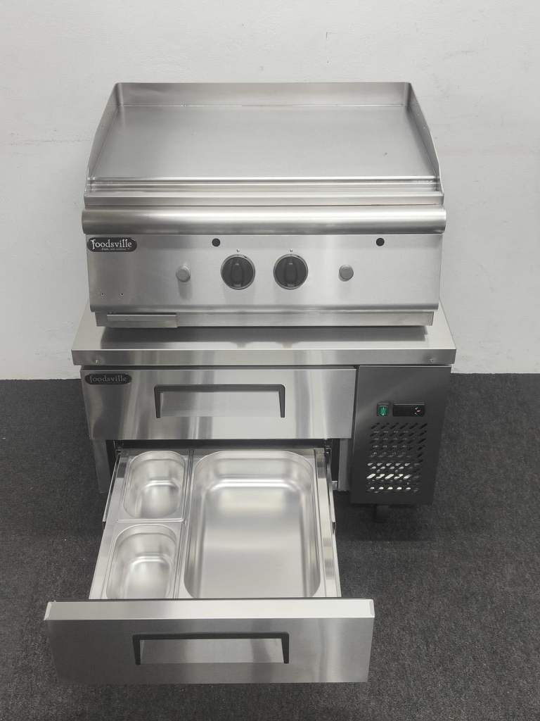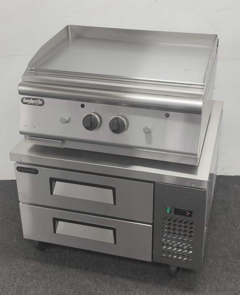 FOODSVILLE COMBINATION: NEW Heavy Duty Gas Griddle On CHILLED Double Drawer Chef Base Chilled Drawers With GN Containers Included!
