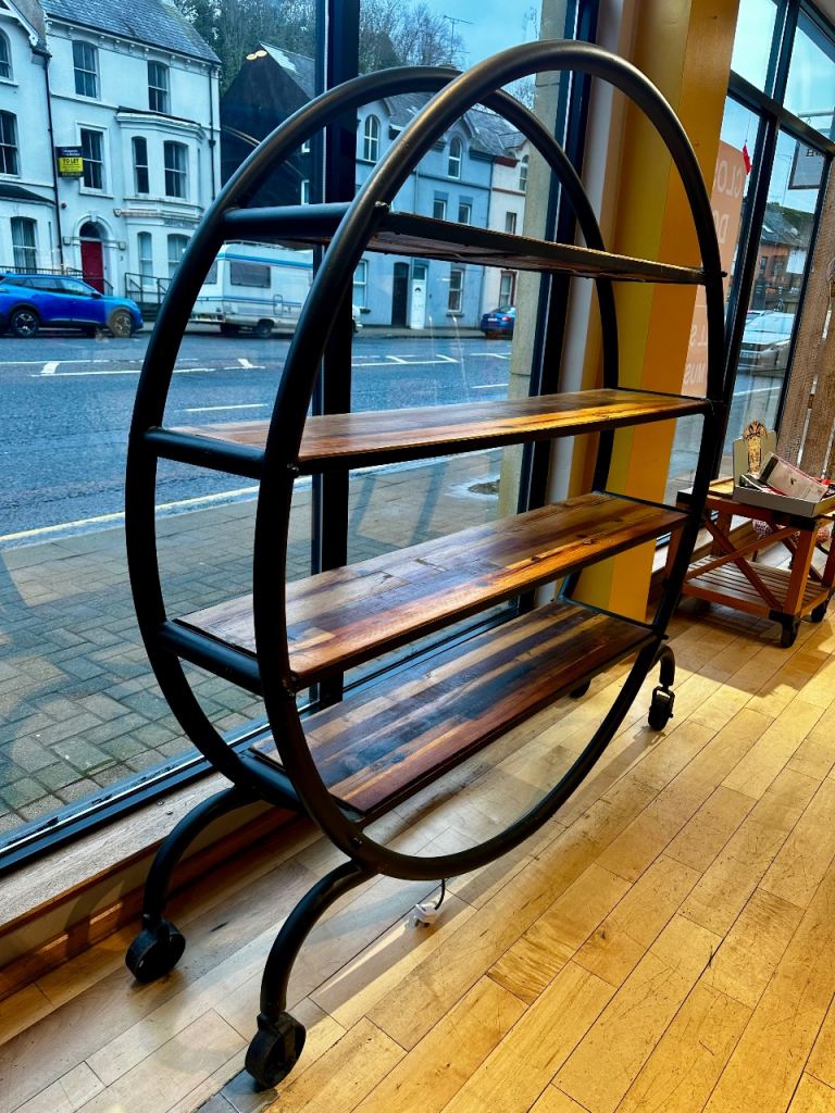 Statement industrial-style circular shelving unit with black metal frame and solid wooden shelves. Features four generous shelves within a striking round design, mounted on castors for easy movement.