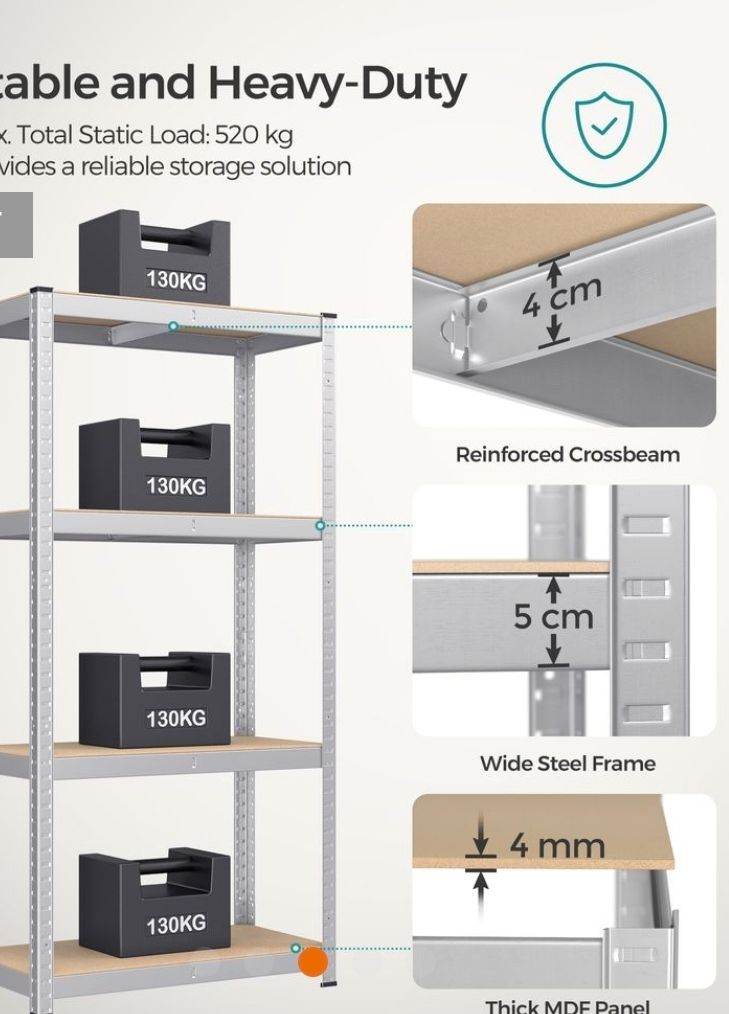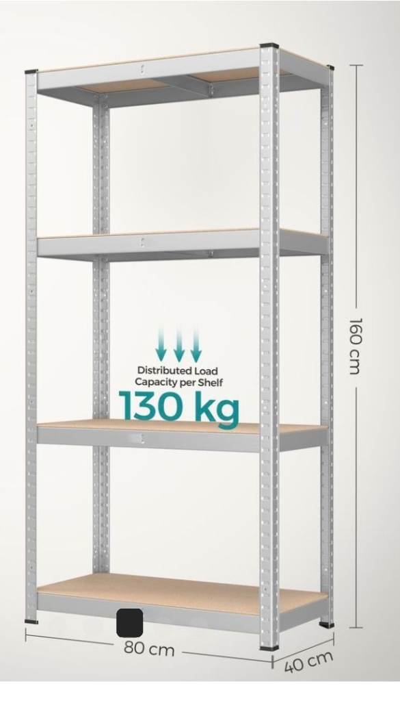 A new still boxed flat packed pair of galvanised 4-Tier Shelving Units, Set of 2 Steel Shelving Unit for Storage, Boltless Assembly, for Garage, Shed, Load Capacity 520 kg Each, 40 x 80 x 160 cm, Silver the full measurements and more information is enclosed in the pictures the r.r.p is 59.99 we are selling them for 30.00 collection only it is st aidens Church summer Bank Road Tunstall st6 5ey we are there mon to sat 9am to 3pm with thanks.