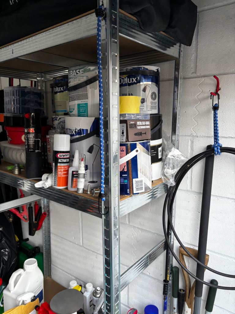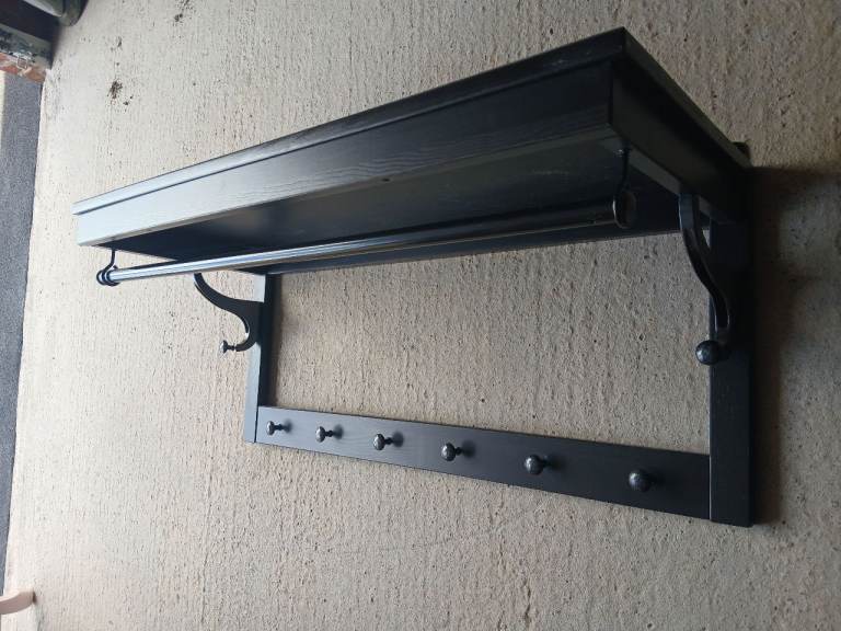 Already built coat and shoe rack. Can hold upto 6 pairs of shoes and hang many clothing. dark Brown wooden with metal trim.