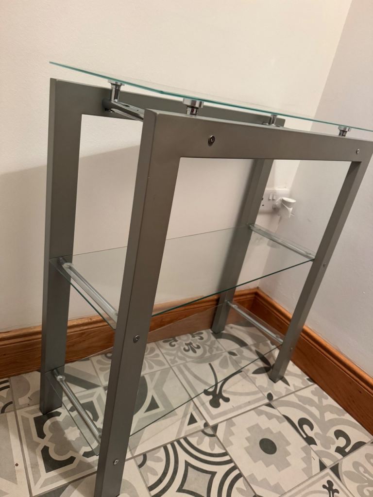 Metal/Glass shelving unit. Frosted glass shelf on top and two clear shelves middle and bottom.