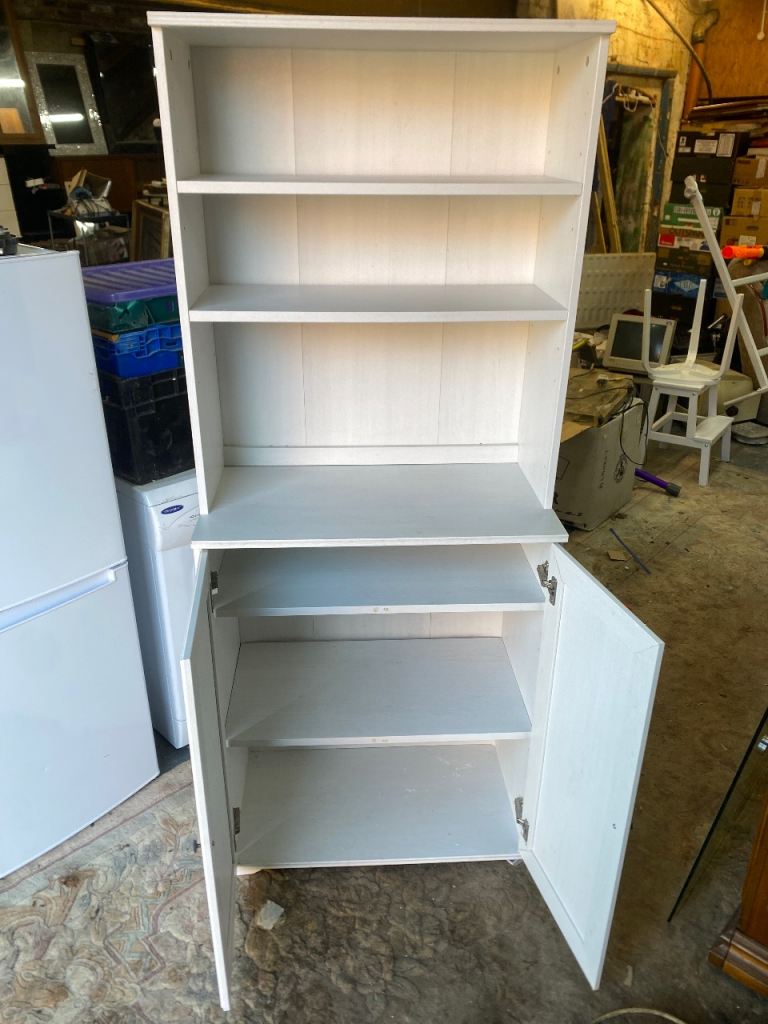 Spacious & sturdy white wooden cabinet with shells and doors.