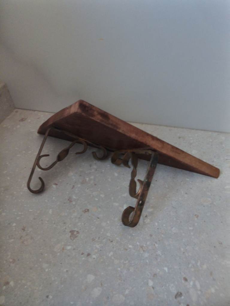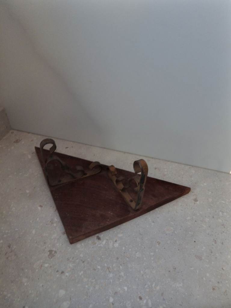 Wood and metal wall mounted corner shelf as pictured. Solid condition.