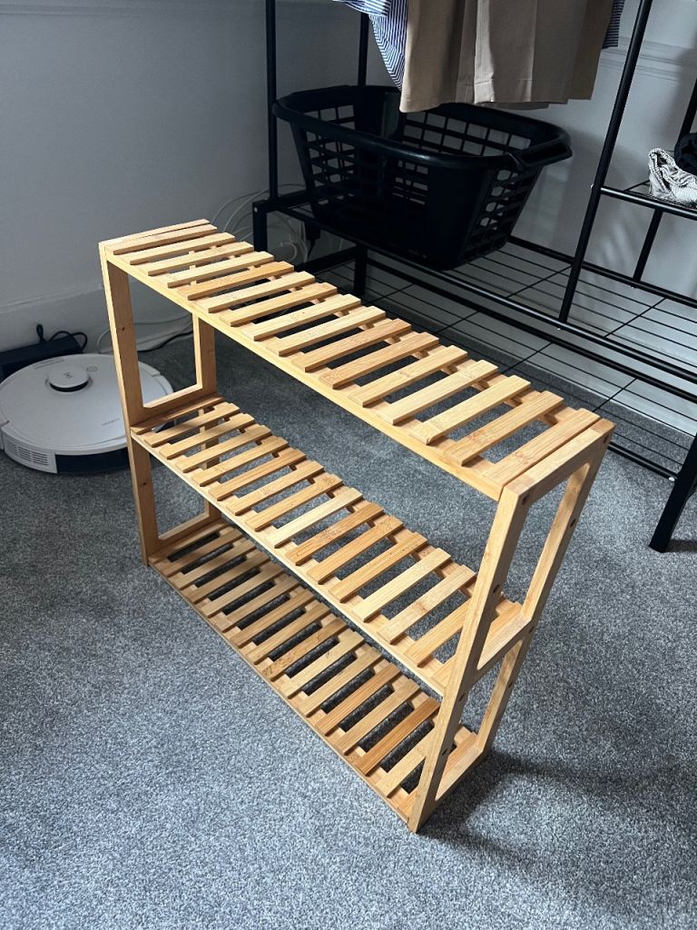 3-tier wooden shoe rack in very good condition. Sturdy, lightweight, and clean — ideal for hallway, bedroom, or wardrobe storage.