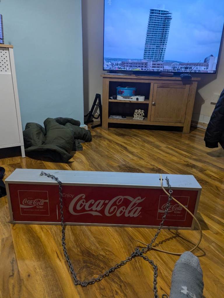 One light up slight crack but not really noticeable and metal sign would look good on a shed building or anything for fun grab a bargain