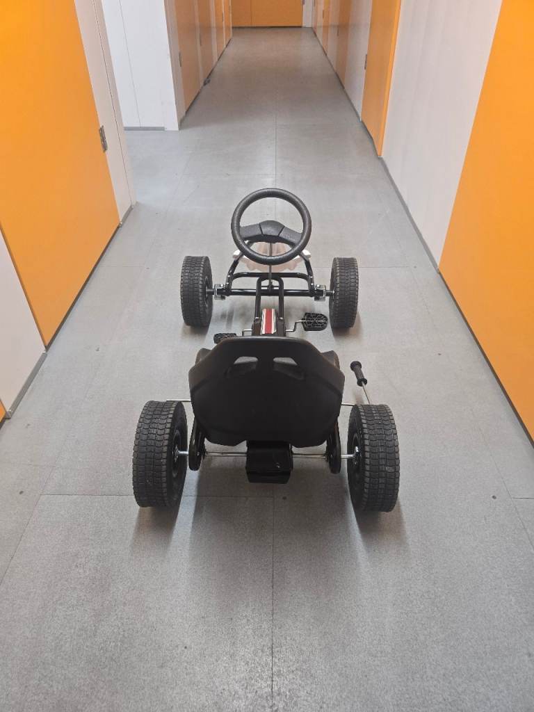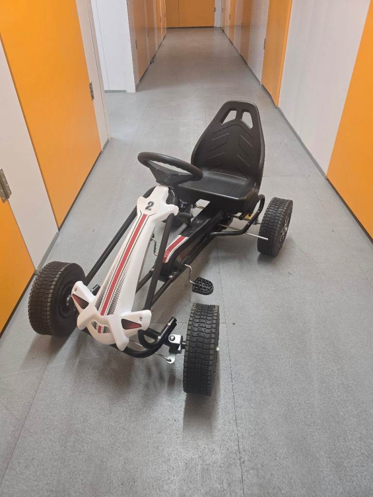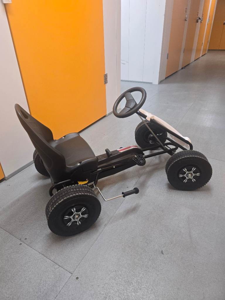 It is a pedal-operated go-kart that allows children to accelerate forward, brake, and pedal backward for reversing.