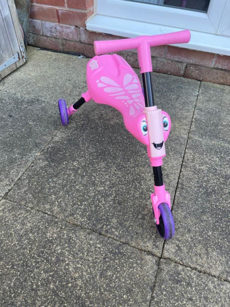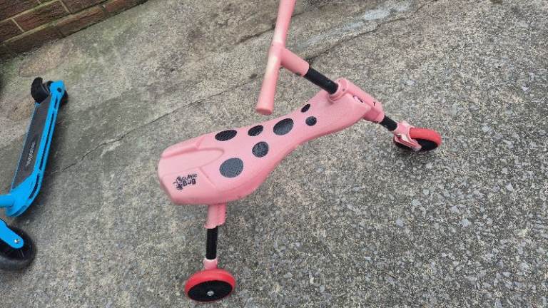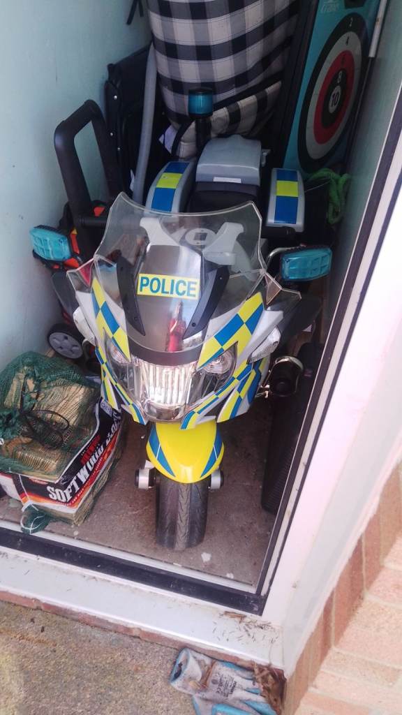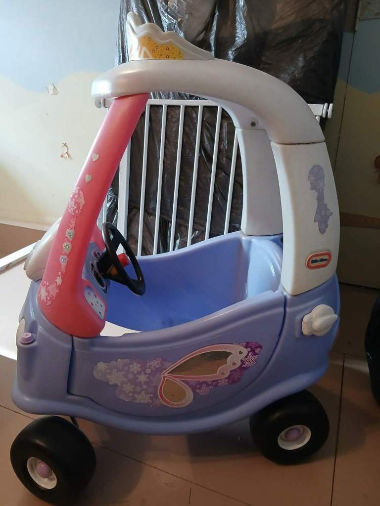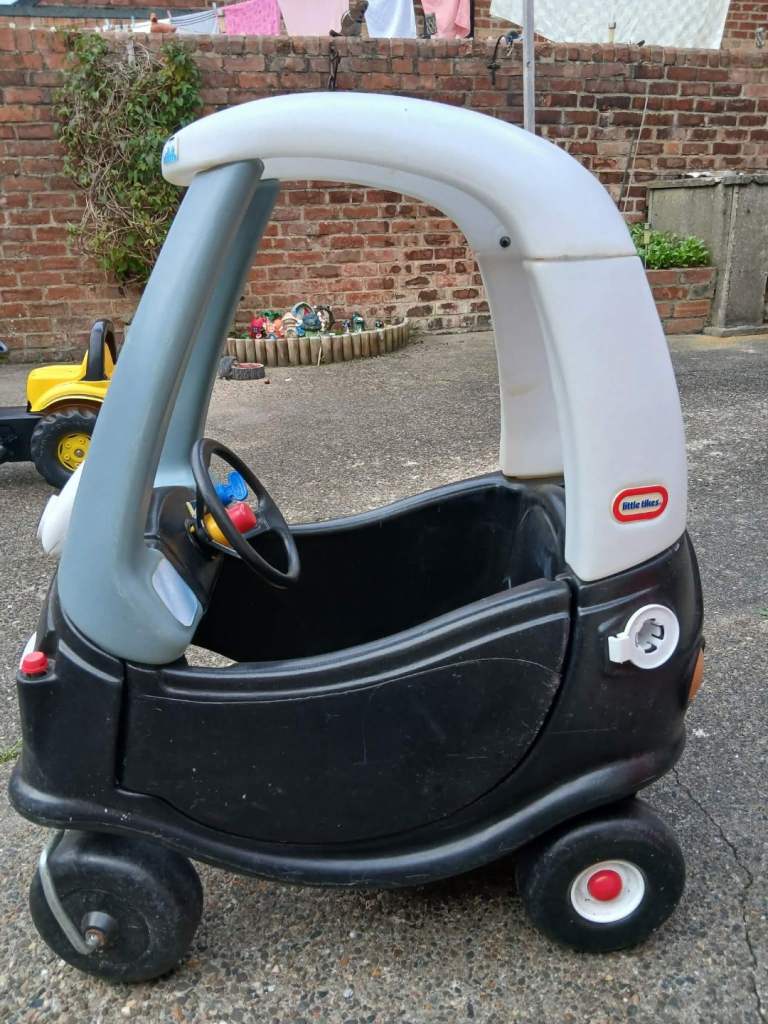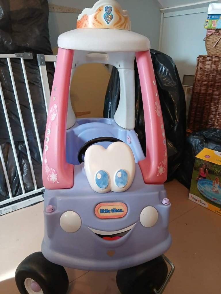 Little Tikes Police car and purple/pink cartoon faced ride-in cars for children.