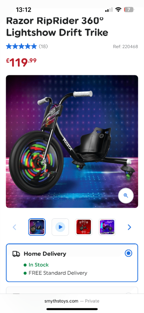 Contents: 1x Razor RipRider 360 Lightshow Trike