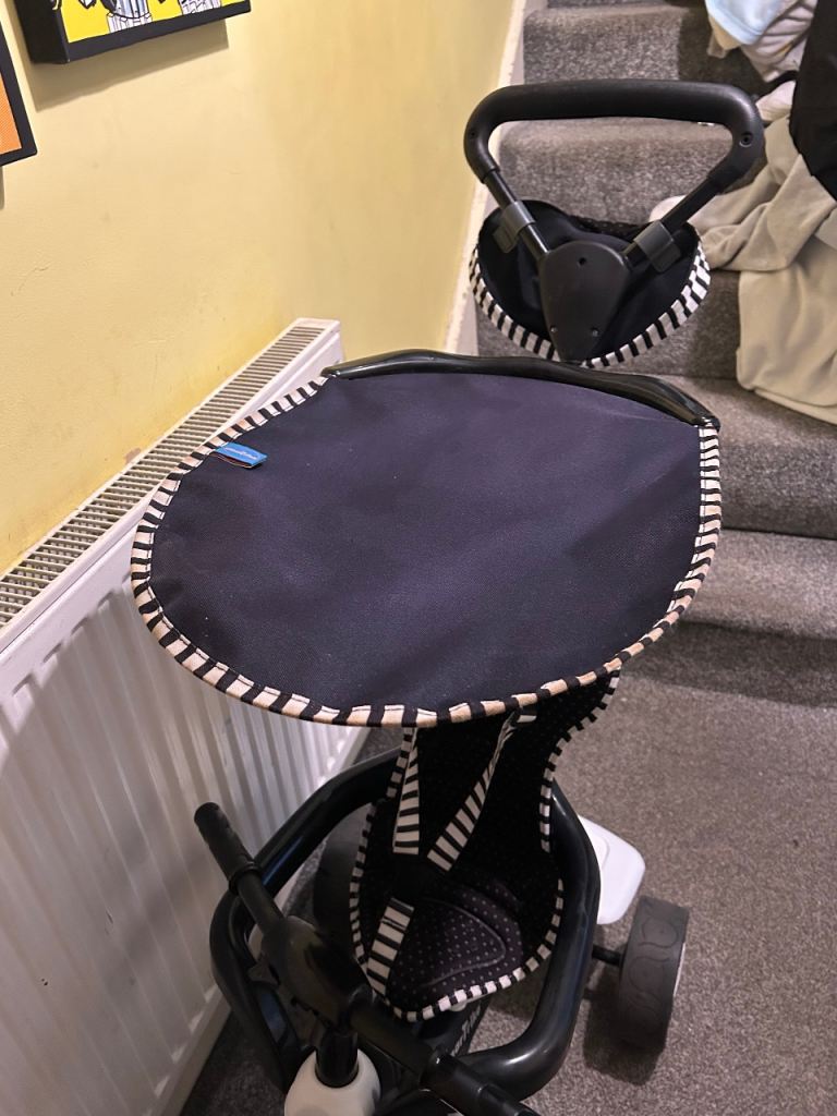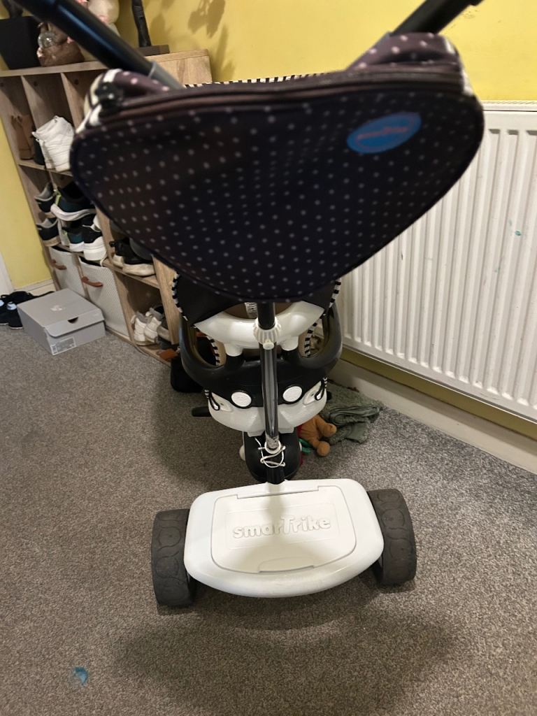 Comes with a bag on handle and a storage box at bottom removable sun canopy and a removable parent handle so can be pedaled on own buy the child