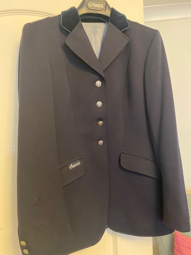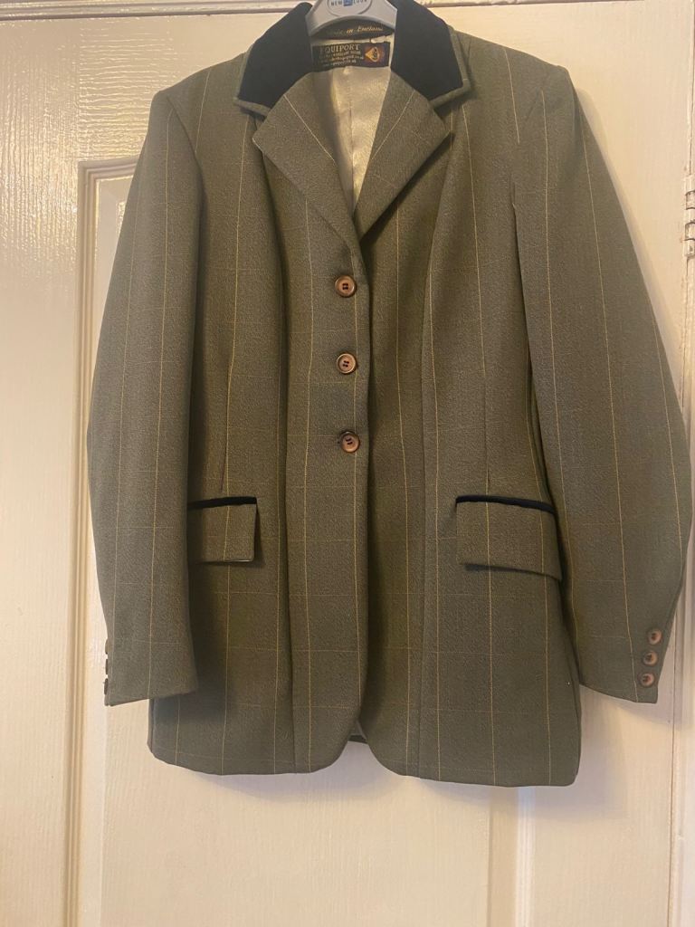 Equiport ladies tweed show jacket size 10 Dark Lovett green colour with fine gold check a navy velvet collar & navy velvet piping on pockets. 3 buttons to front of jacket and 3 smaller buttons on each sleeve. This jacket was very expensive & has only been worn once so as new condition.