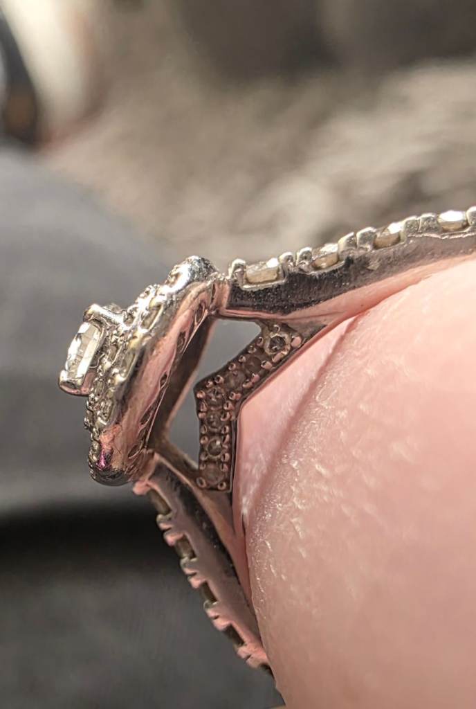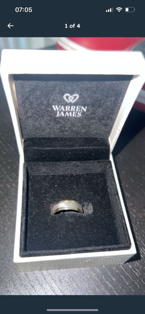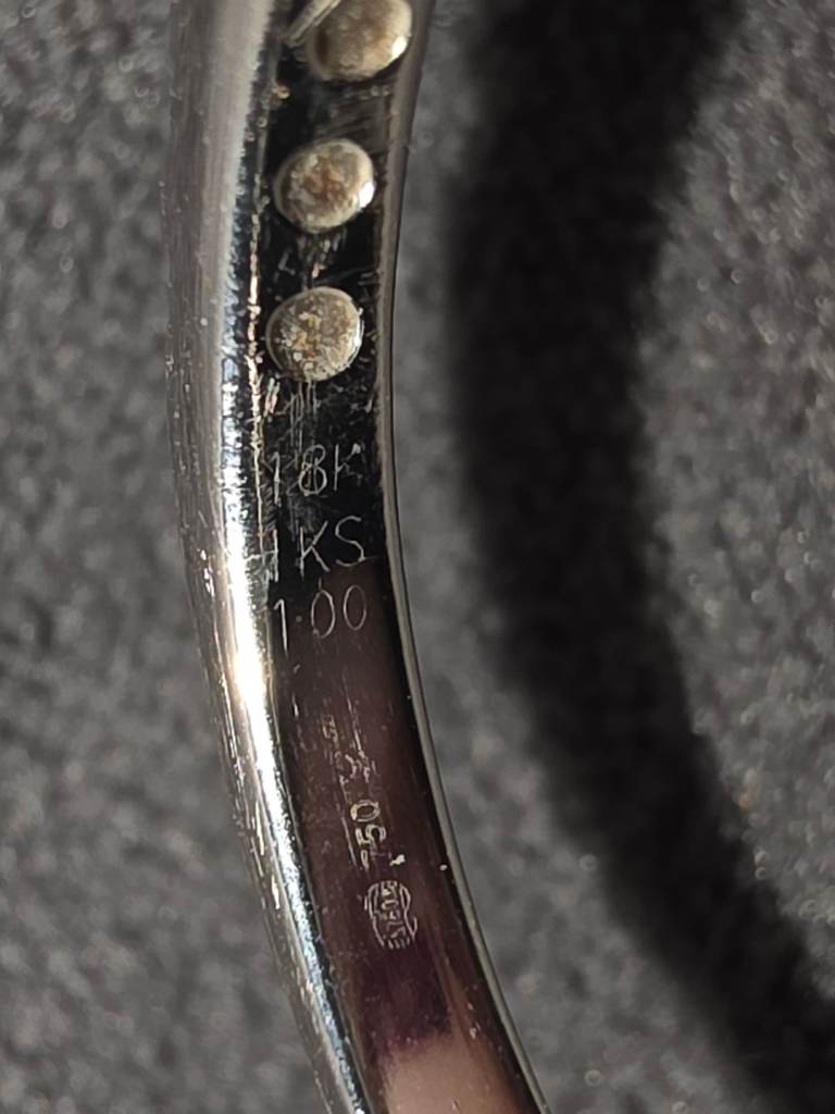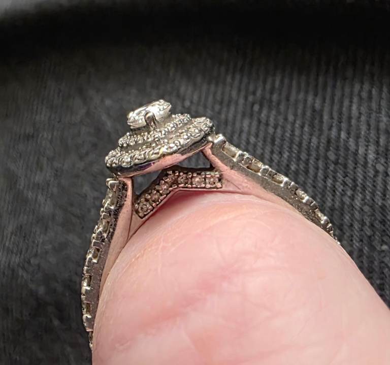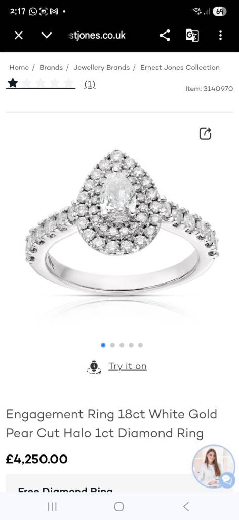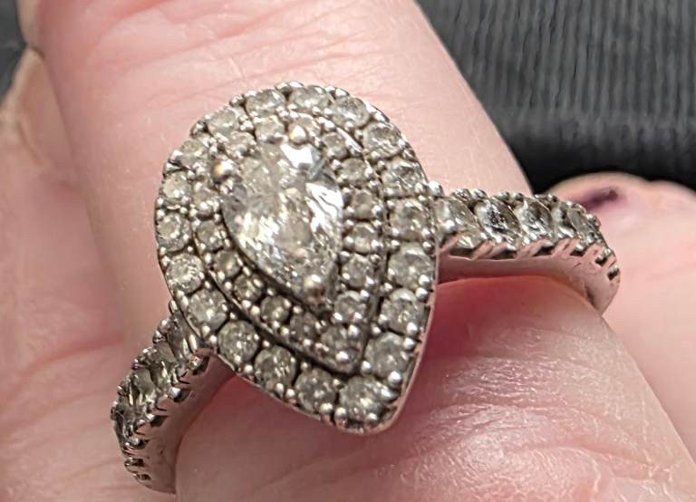 Still selling on earnest jones for £4250. This 18ct white gold ring features a stunning pear-cut diamond as the main stone, surrounded by a beautiful halo of smaller diamonds. The elegant design makes it a perfect choice for an engagement ring, with a band style and a total carat weight of 1. Size o