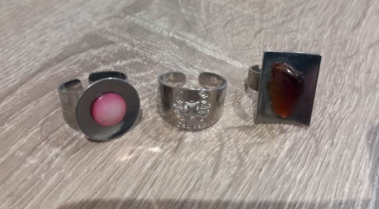 2 with stones: pink & amber. The other is engraved with Cancer the Crab. All in excellent condition. Collection ONLY. In Craigavon.