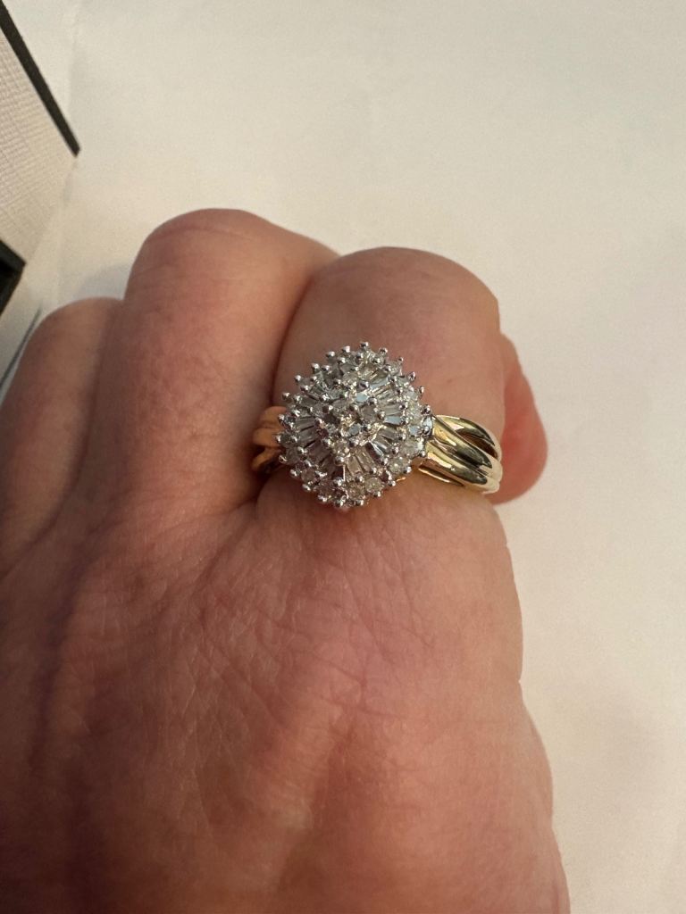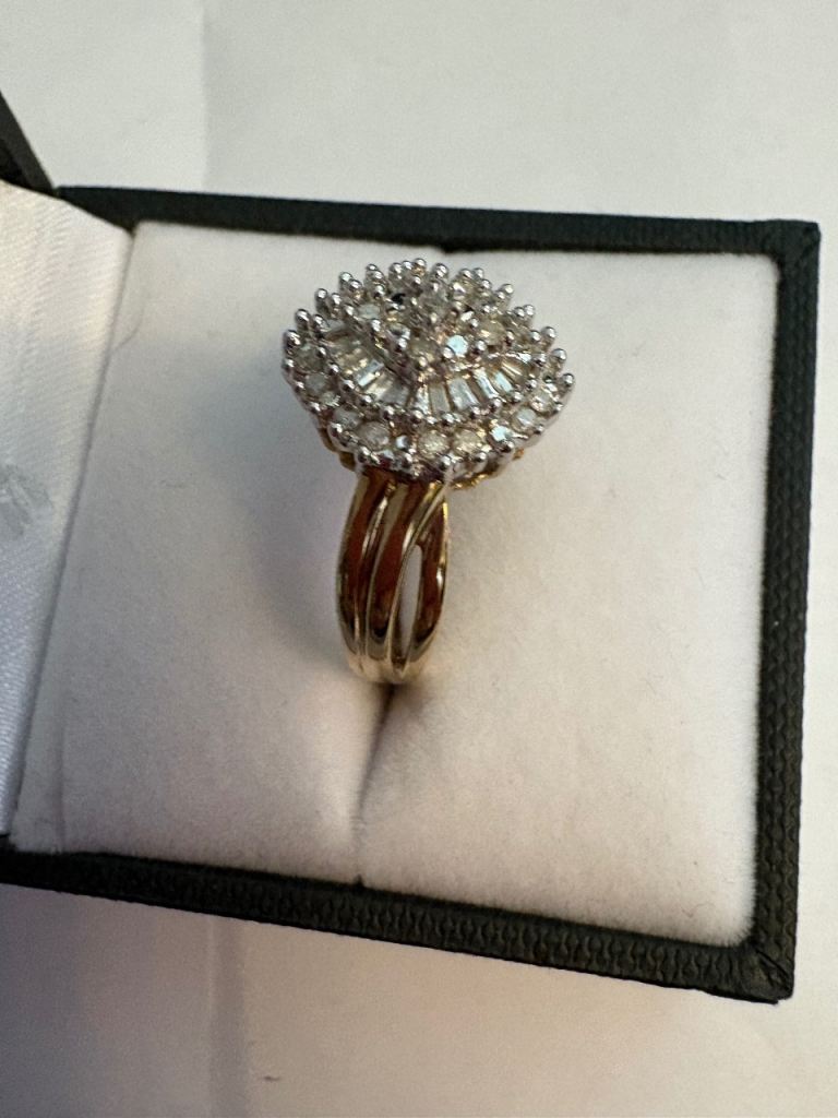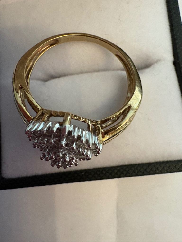 Stunning vintage 9ct gold 1ct diamond cluster ring in size R, fully hallmarked superb condition only worn twice, amazing round and baguette cut diamond design looks fabulous on comes boxed