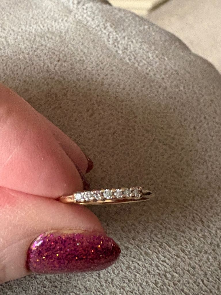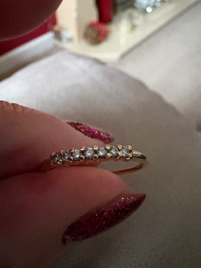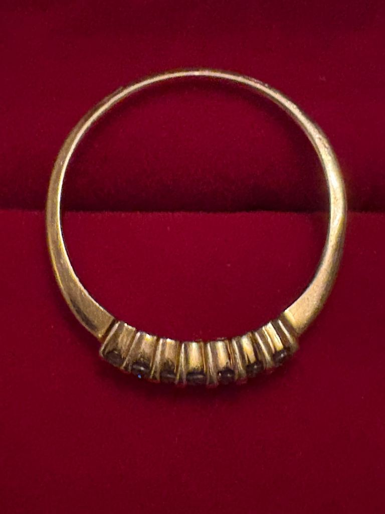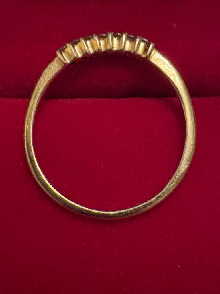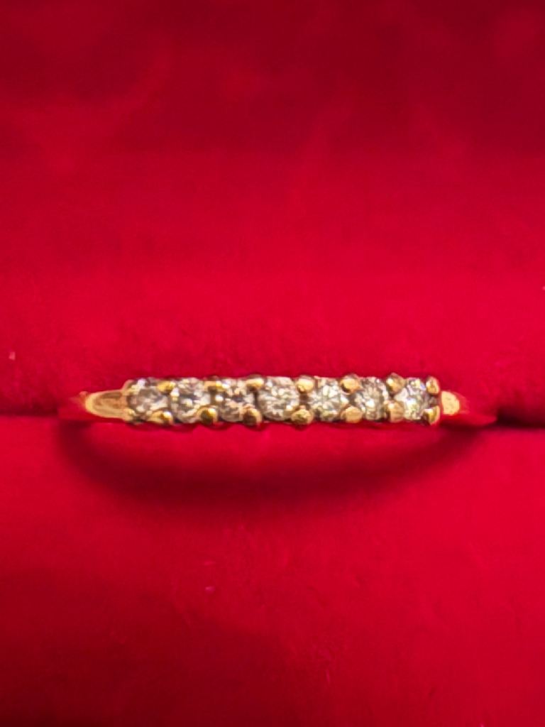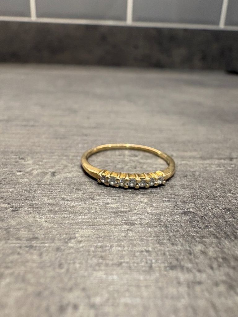 Hallmarked 14ct solid gold .21 ct Diamond Eternity ring with 7 diamonds. In beautiful condition- Size P. Only selling as it no longer fits. Has been professionally cleaned.