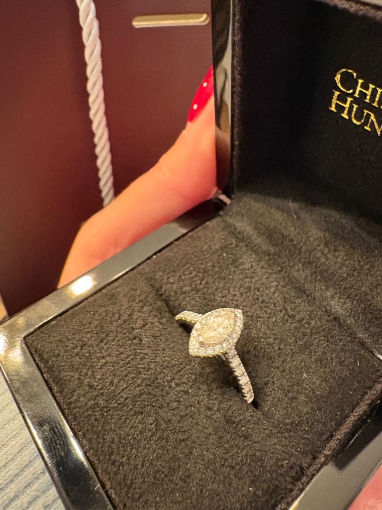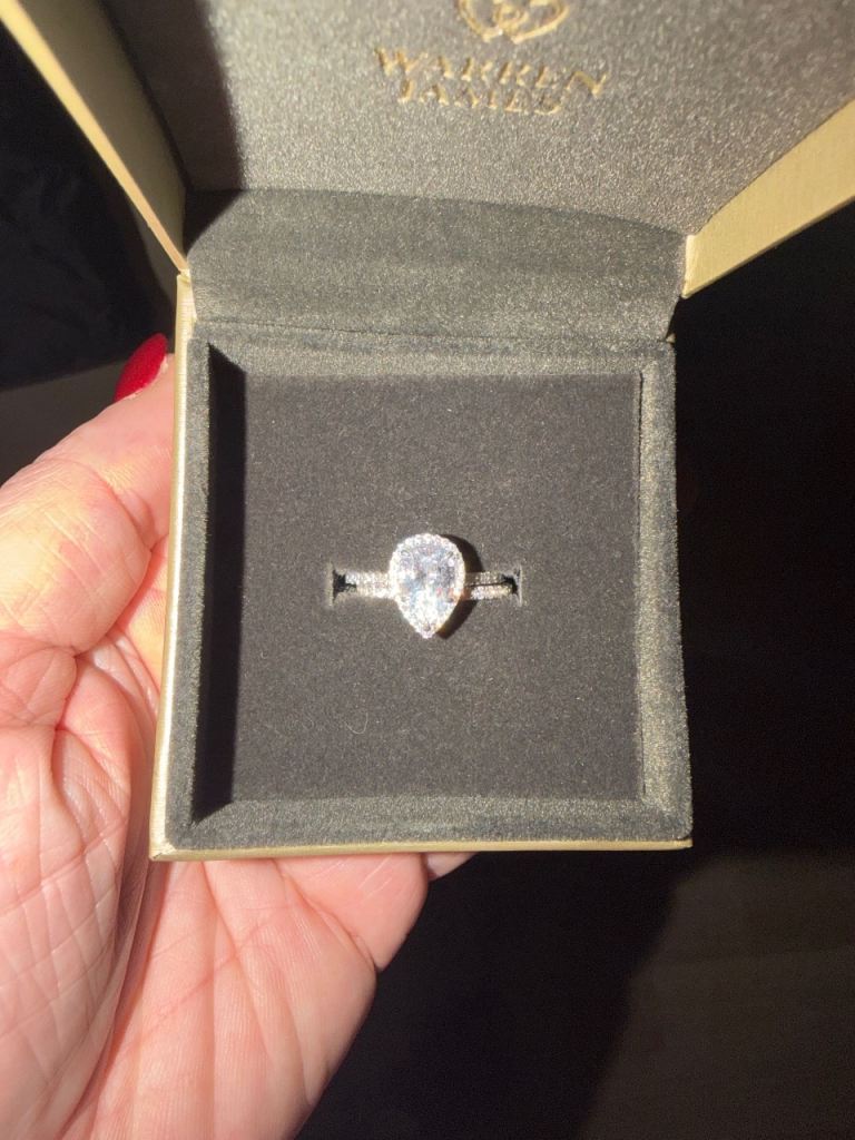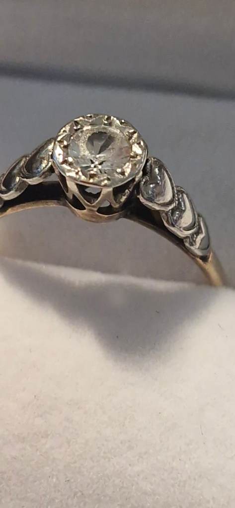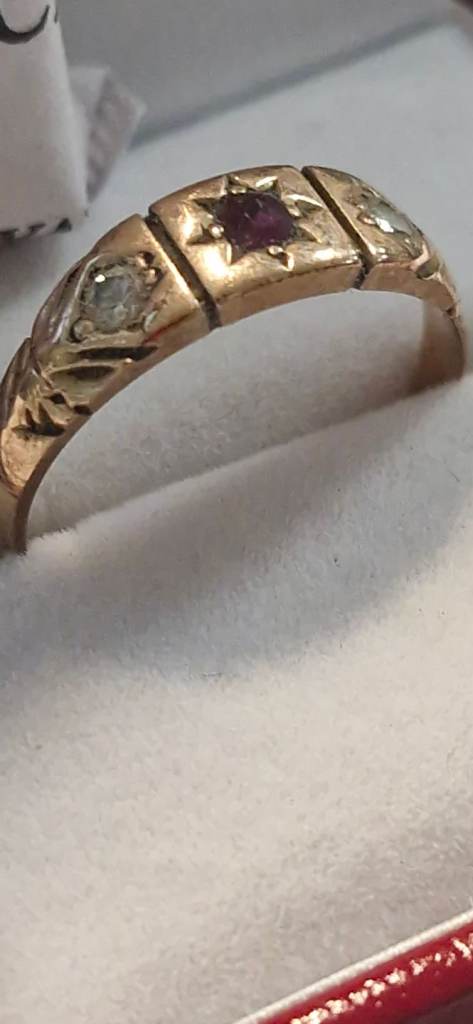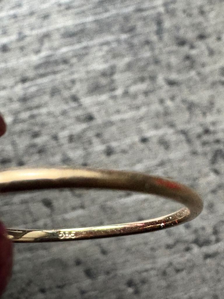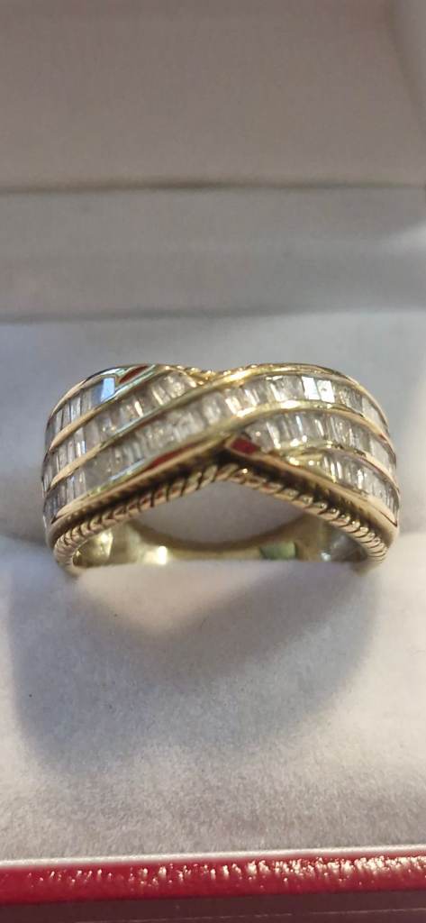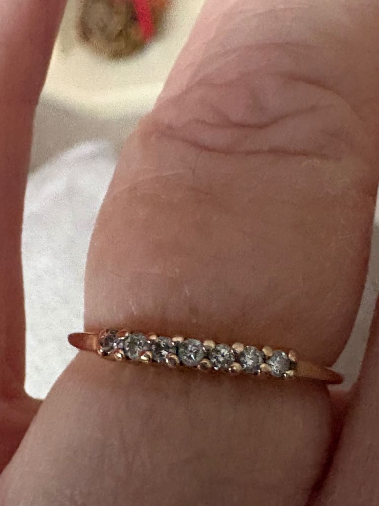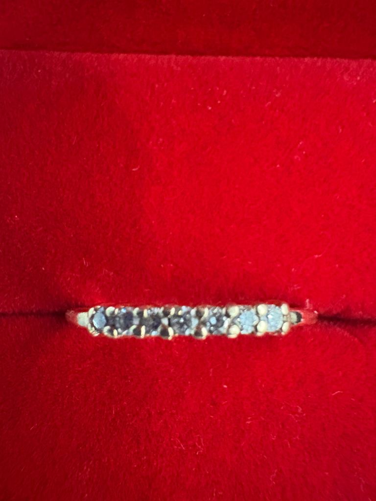 Hallmarked 14ct solid gold .21 ct Diamond Eternity ring with 7 diamonds. In beautiful condition- Size P. Only selling as it no longer fits. Has been professionally cleaned.