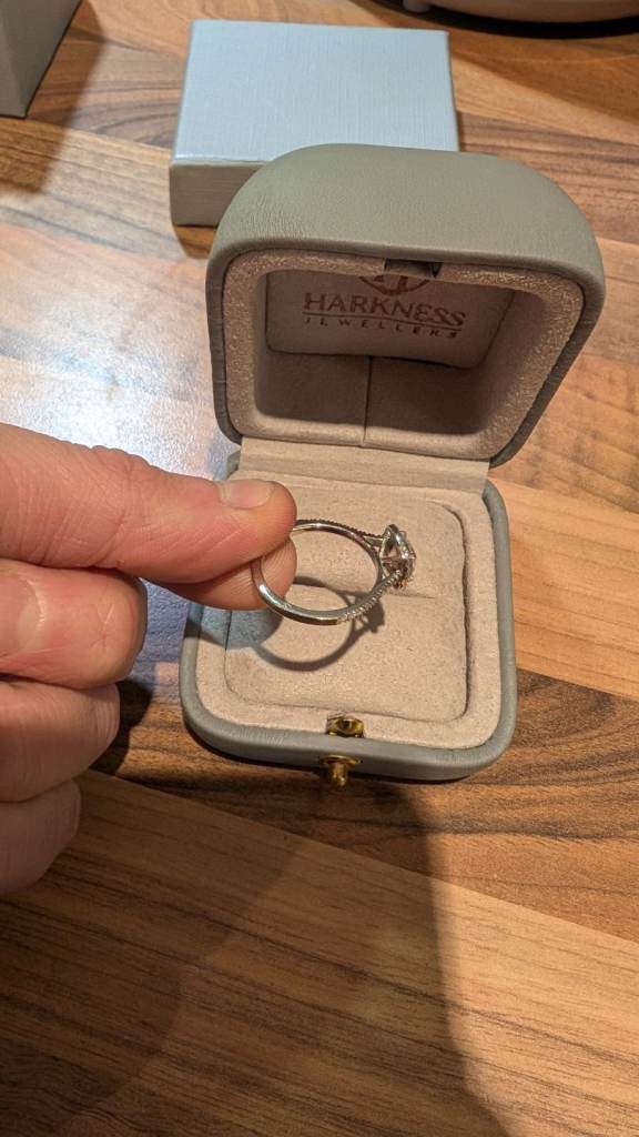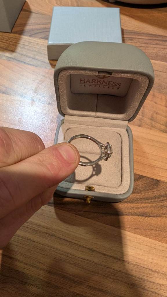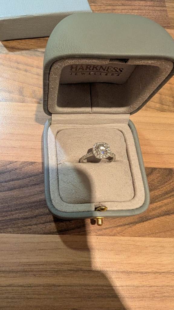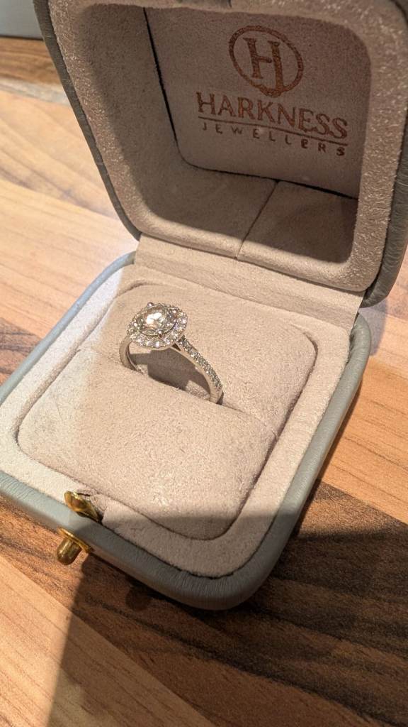 Beautiful platinum engagement ring featuring a stunning 1.08ct round brilliant cut lab-created diamond, certified F colour / VS1 clarity. The centre stone is set in four claws and surrounded by a halo of round brilliant cut diamonds, giving the ring exceptional sparkle and presence.