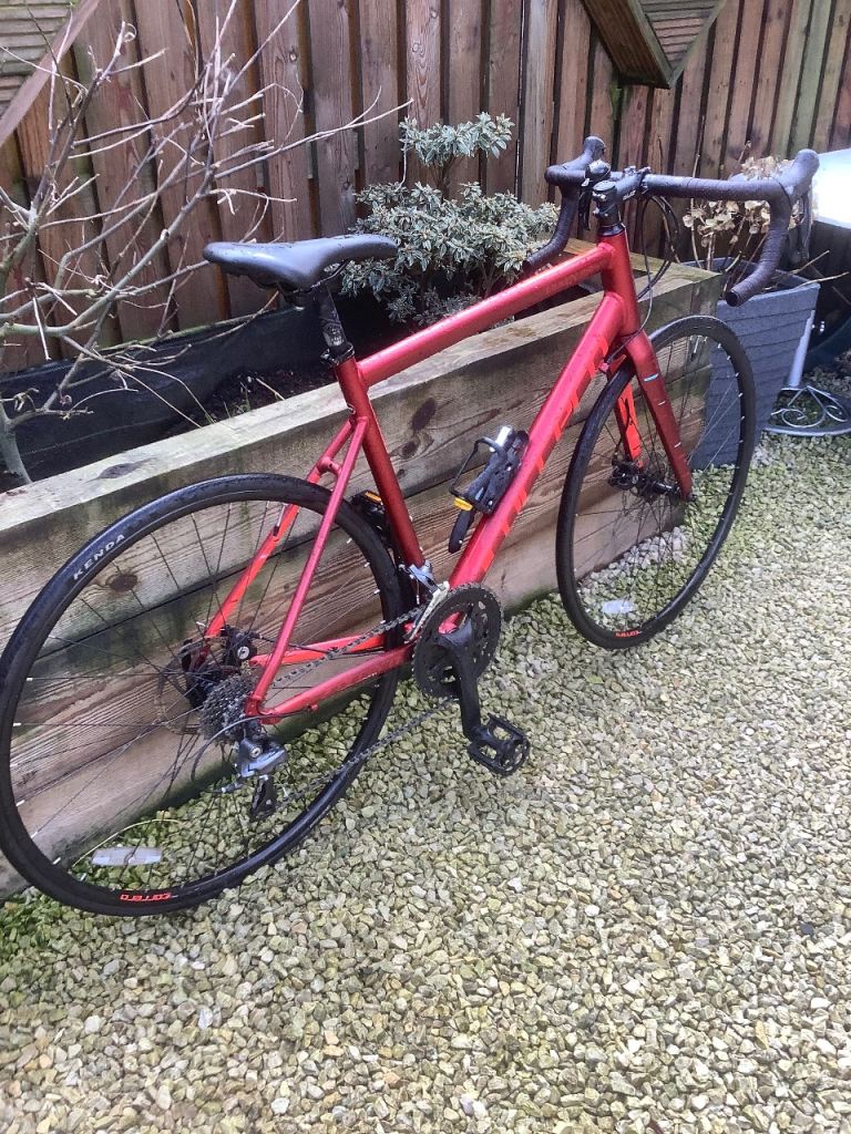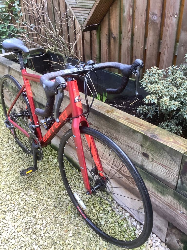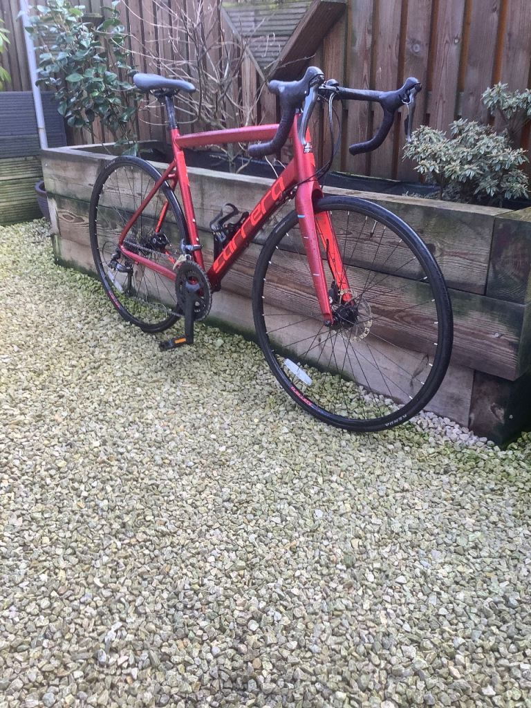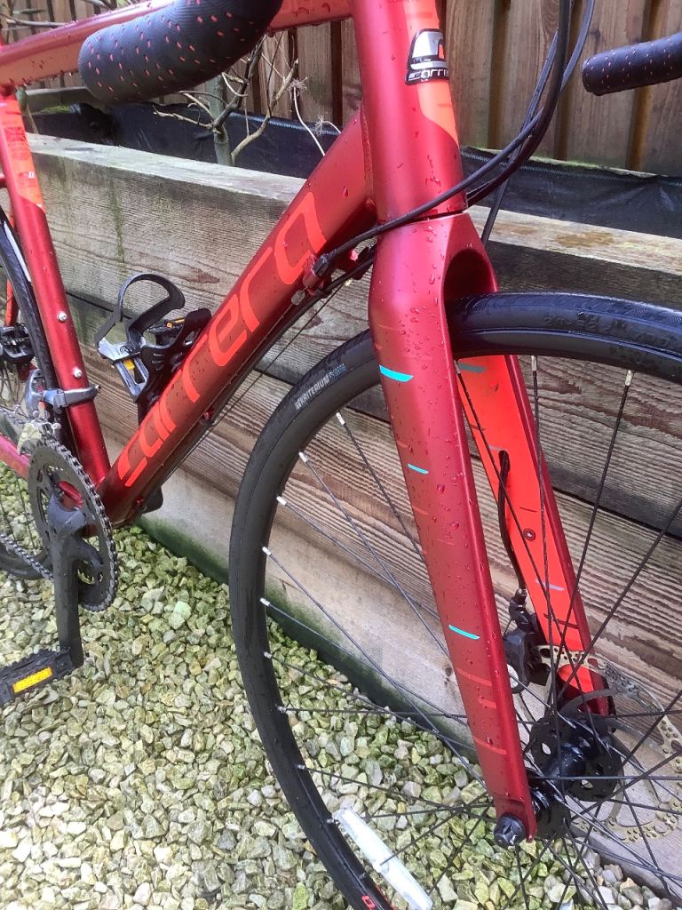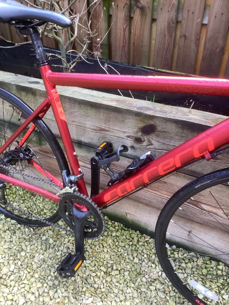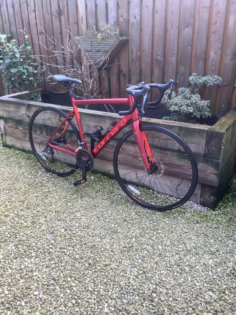 Stunning in as new condition Carrera vanquish Road bike . It’s a 54 cm ( medium ) frame so fits 5ft 7 to 5 ft 11 ish .. super lightweight with fully carbon forks , high end components Shimano Claris 2x8 gearing , 700x28 c puncture resistant hybrid resistant tyres , Tektro disc brakes ..This is the latest model of this incredibly popular roadbike, and this model and colour are being sold in Halfords for £485+ …just been serviced so as good as new at a fantastic price …