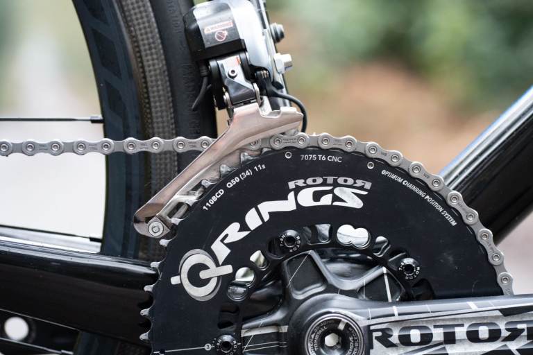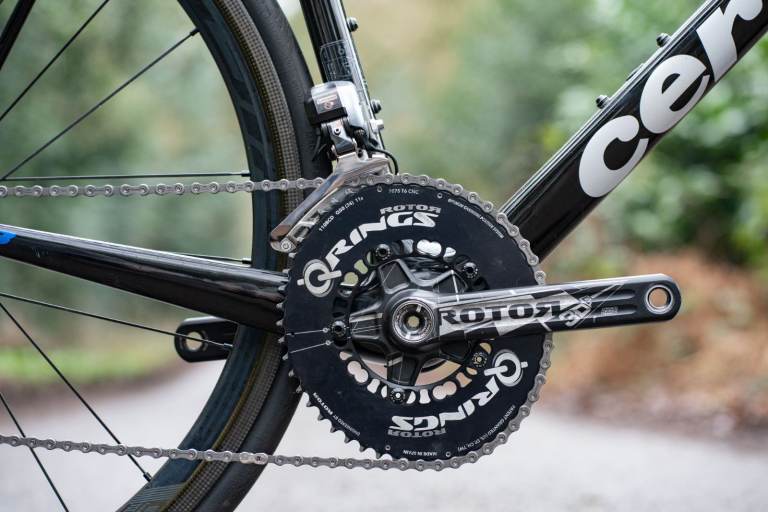 Top of the range Shimano Dura Ace Di2 2x11 speed electronic groupset including the brakes with a Rotor chainset which features their Qrings. Di2 is working flawlessly with no excessive wear to the components.