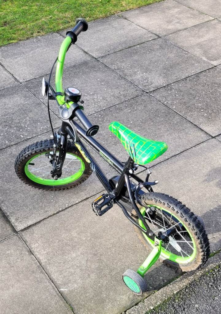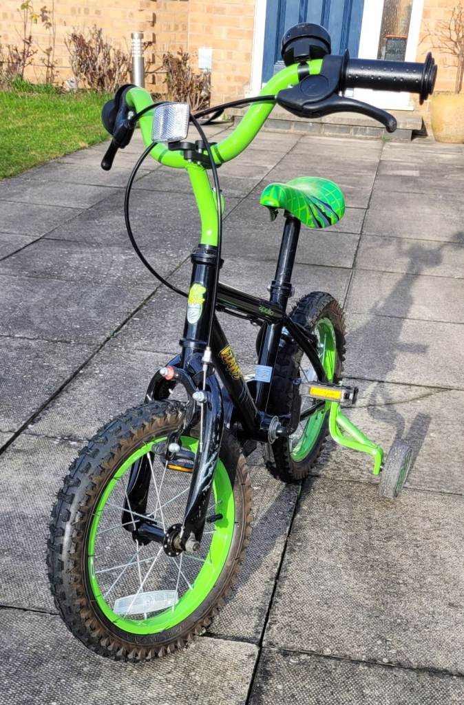 This is an Apollo Claws bike with detachable stabilisers. It has 14" wheels and is suitable for an age range of 4 to 7. My son learned to ride on it but has now outgrown it. In nice rideable condition with minor wear and a few minor marks. Halfords currently sell these for £110, I'm asking £40