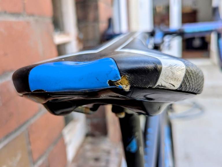 Some scratches and marking on the frame, a small tear on the back of the saddle and a couple of easily replaceable slightly rusty bolts. See photos for details.