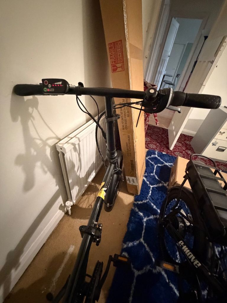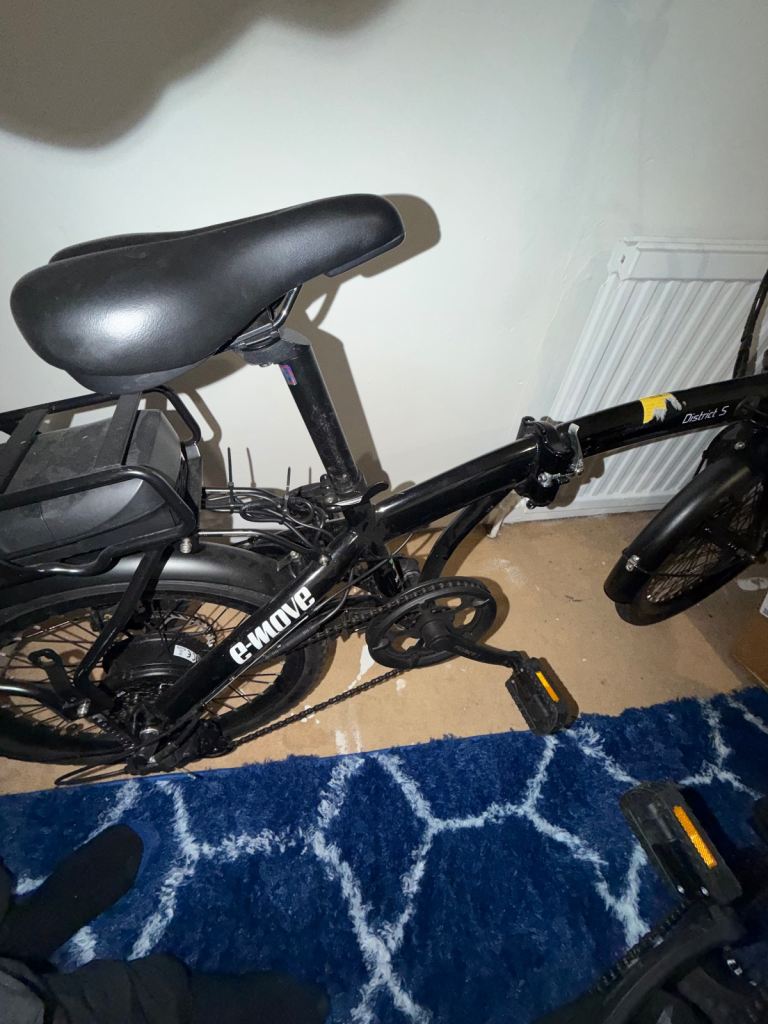 E- Move district-s electric fold-up bike comes with a charger fully working return pallet the one closest to the wall is for £300 and the other £250 both has a charger call me for more details I’m look to sell both of them together £550